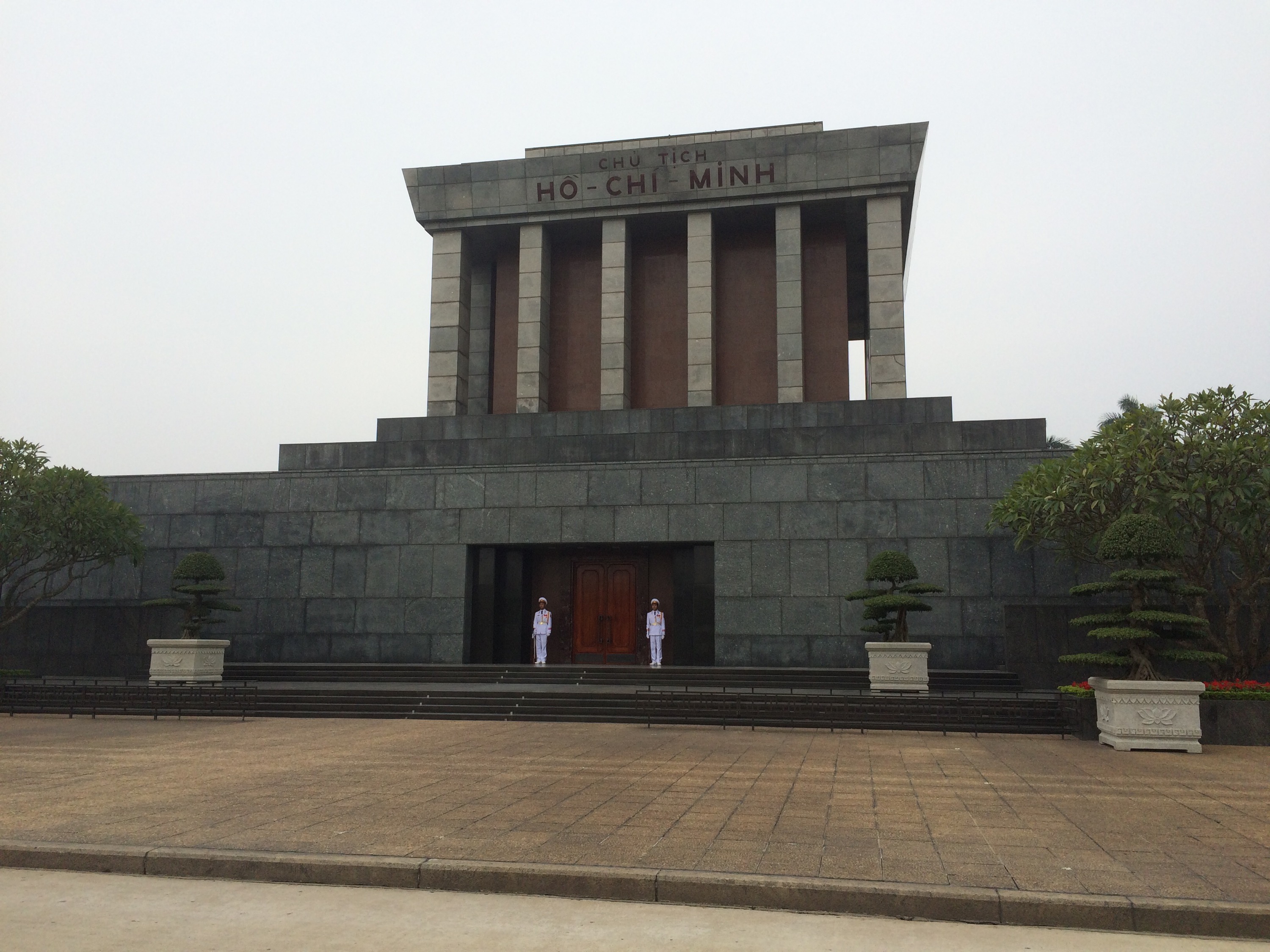 Ho Chi Minh always wanted a unified Vietnam and worked to his death to achieve it. Even to demand that he be cremated and his ashes be in all parts of the nation. At the time of his death in 1969 the population of the country was 37 million and is now 92 million. Nevertheless his internal organs were cremated but the rest of his body was embalmed and is taken to Russia each year for re-embalming. Otherwise he is in an impressive Mausoleum with an upper reviewing platform and is his body lies in state belly ground in a glass coffin. It is closed on Friday so we did not visit. Front and rear views attached. >br />