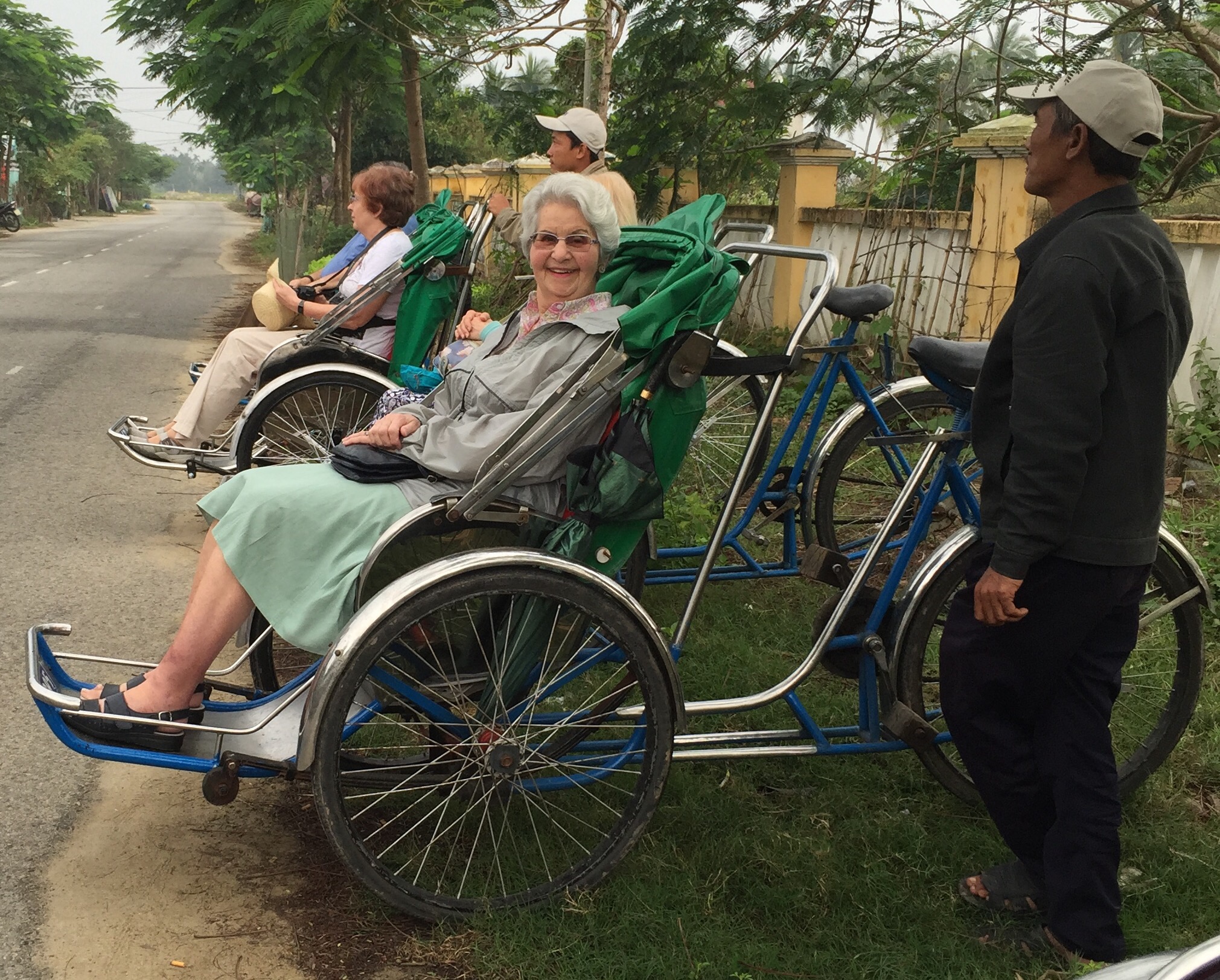 I also add a picture of Judy in a Cyclo yesterday, the rickshaw bicycle thing many of us rode in during the bicycle ride, permitting greater freedom for pictures and looking at the scenery.