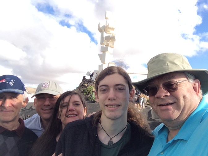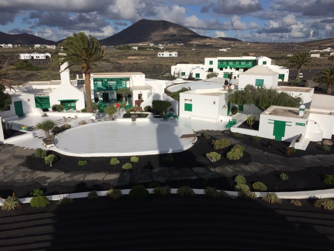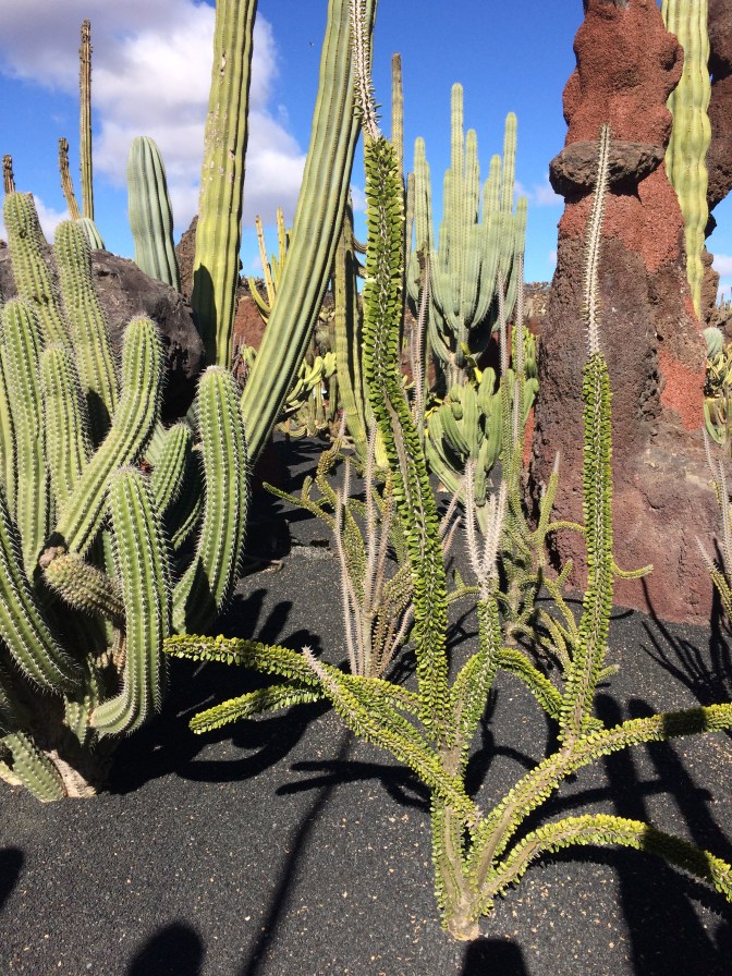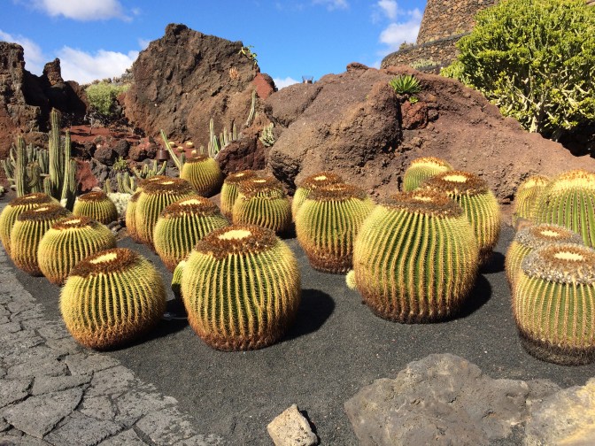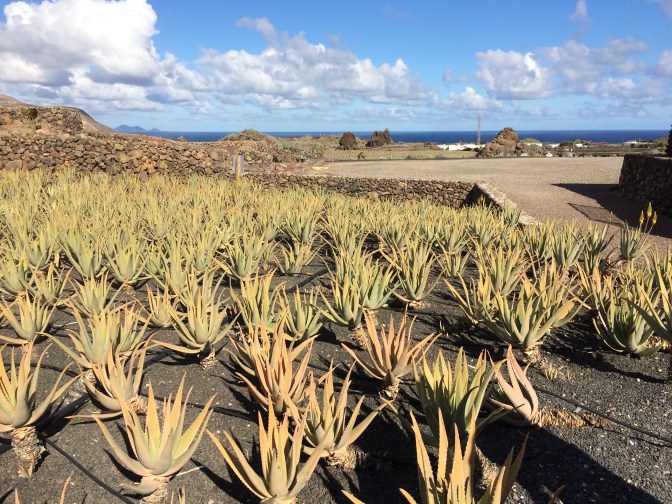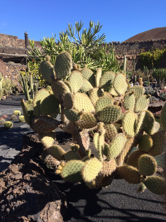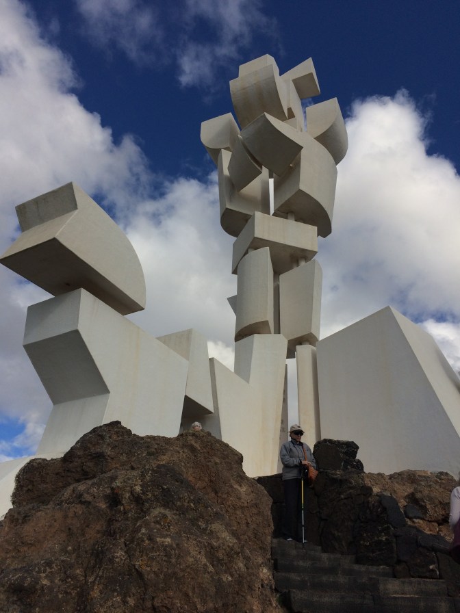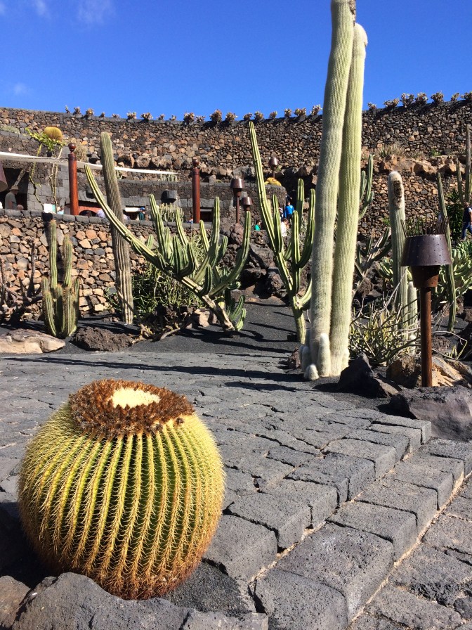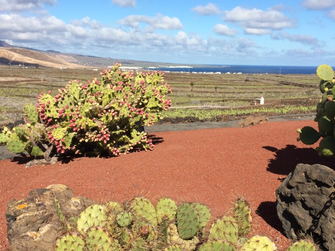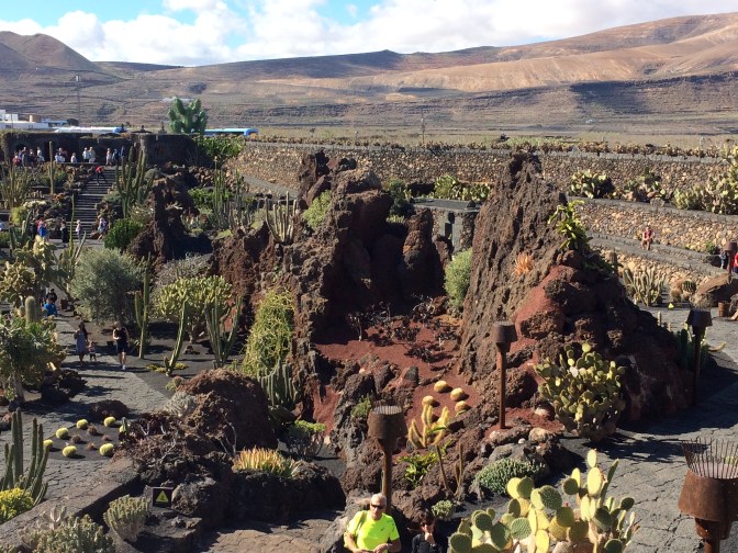 Our next stop was in the village of Orzola to visit the Aloe Vera Farm, where we saw how it is grown, harvested and even tasted some of the raw gelatinous center of the leaves. The yellow liquid which comes off the plant when opened if ingested, causes diarrhea. We also tased Aloe Vera Cake and a Liquor made from the plant. The next stop was in the spectacular stone built enclosure that is the cactus garden of the afore mentioned Manrique, with over 1,500 plants of some 100 species. We enjoyed a drink and wandered through the gardens, which were spectacular. Growing on the cacti can be found the cochineal beetle, used to color clothing red and drinks such as Campari and was in wide use by many ancient cultures. Having traveled outbound up and over the narrow hairpin curved over the Volcanoes (some 300 on the island), we returned to the capital by the seaside, flat black landscape. It is of real note that there is a sharp contrast between the white houses (all have to be painted white as established by Manrique) and the black lava sand that is almost everywhere else. Other interesting points of interest is that plants, grapes and other crops are planted in the soil some 20-30 Centimeters under the black sand. Due to the prevailing winds (N to S) each plant has to have a semicircular wall built around it so that it is not blown down. There is no University education on the Island, but there is a Tourism higher learning establishment. Tourism is the mainstay of the economy, with agriculture, which was very big, now is greatly reduced with most items imported from Spain.