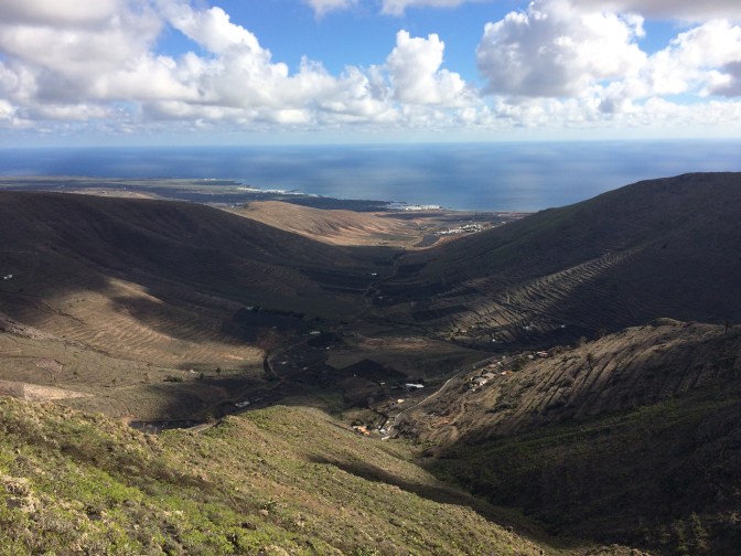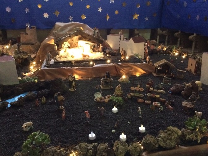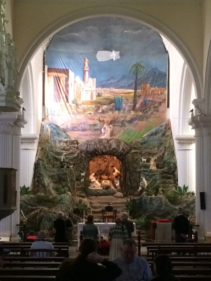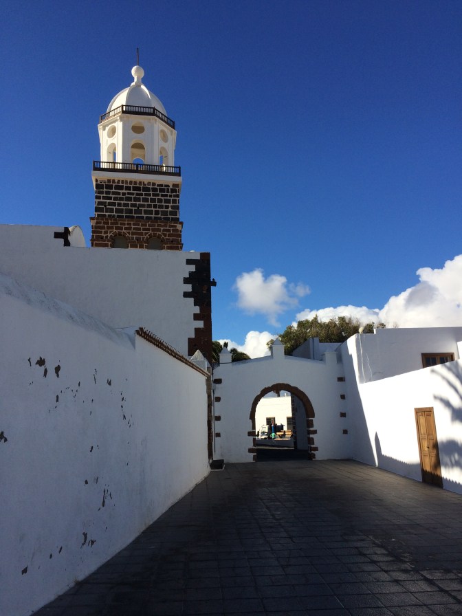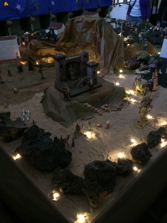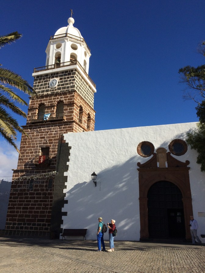 We all decided to take the Hidden Lanzarote tour. We visited the old Capital – Teguise (which has been declared a site of historic and architectural importance), making a stop at Haria viewpoint with the abstract Staue by Manrique to the farmer, his wife, a dog a camel and a donkey, which offers a great view of the northern part of the island and other islands. In San Miguel Teguise (a place that bears the name of the daughter of Guardafra, the last Guanache King, who married the knight who conquered the island for Spain – Jean (Maciot) de Betancourt). We took a walk to Constitution Square where the Church to our Lady of Guadalupe is located. Extensive manger scenes decorated the church as it was just after Christmas.