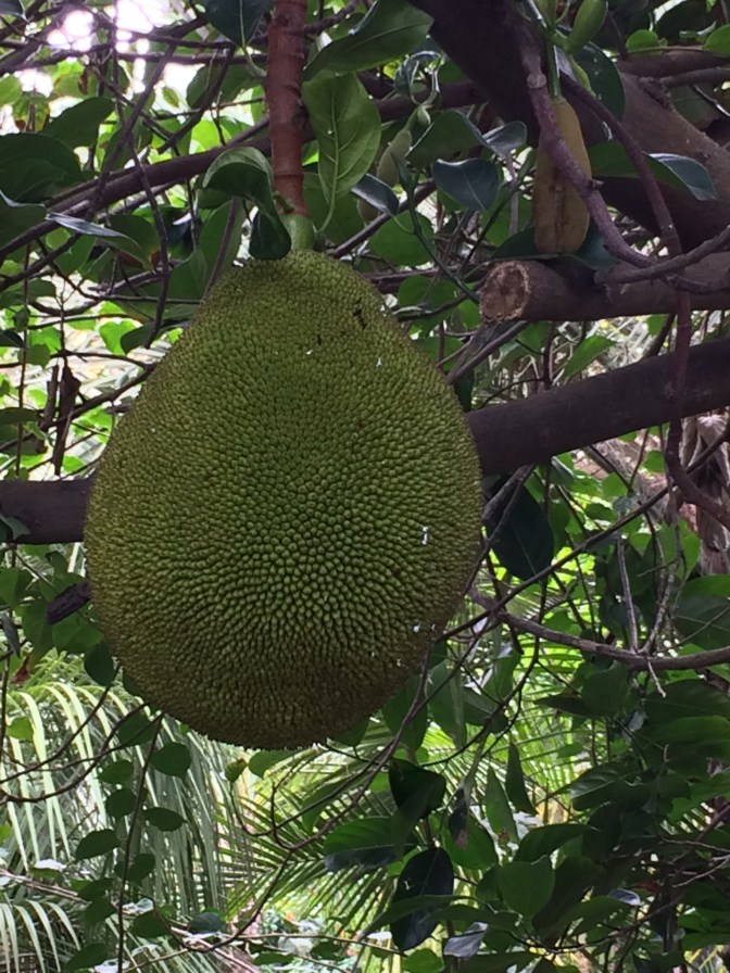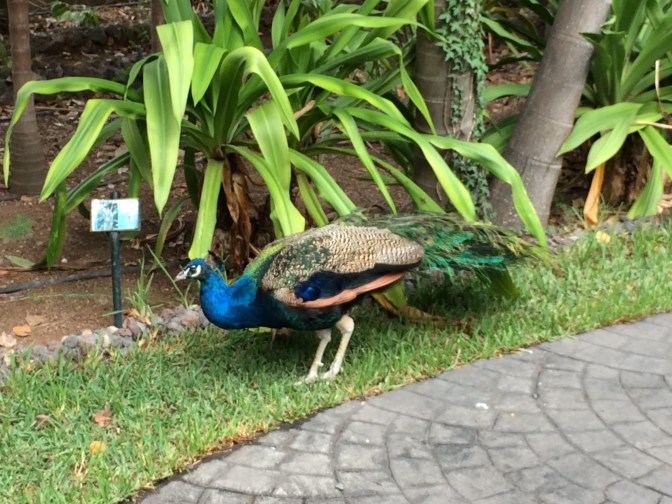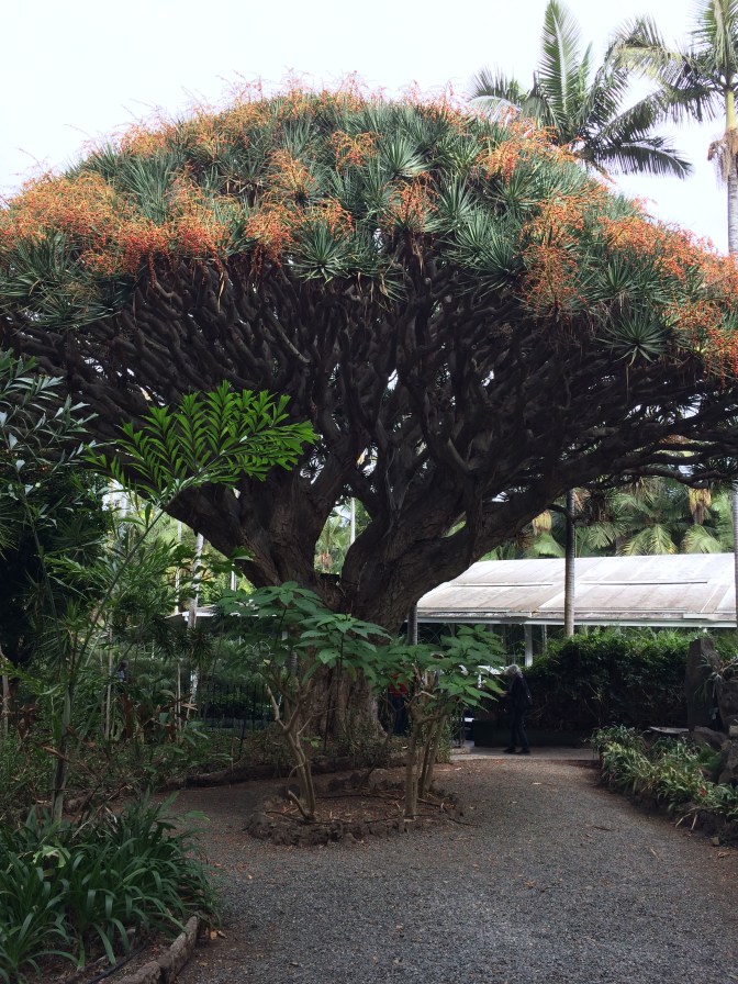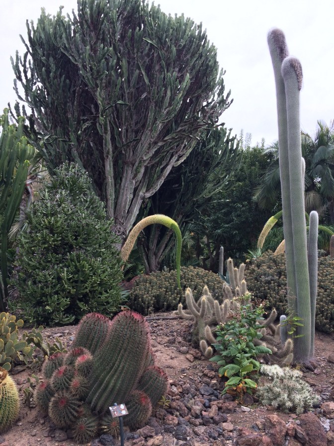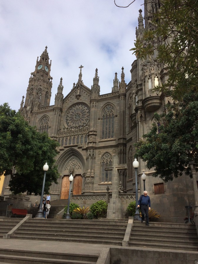 We then travelled to the cobble stoned city of Arucas, it’s homes, churches (the grey neo-gothic one finished in the 1970’s, is similar to the one in Barcelona as the architects were the same) and Marquise’s de Arica Gardens where we sampled the island’s banana Liqueur – a yellow delicious liquid. The gardens were filled with Cacti, palms, bougainvillea, even a Jack Fruit tree – beautiful. Then back to the ship along the North coast to meet up with Alex for lunch. The evening was filled with a light meal in the cafeteria, watching the Arsenal 3 / Crystal Palace 2 football game, music interlude of the joint orchestras doing big band music, and Alesia & Massimo doing their acrobatic artistry with curtains hung from the theatre roof. Off to the next Canary Island for tomorrow – Tenerife.