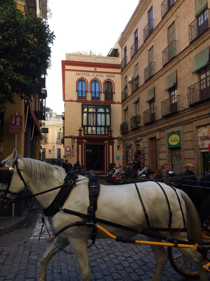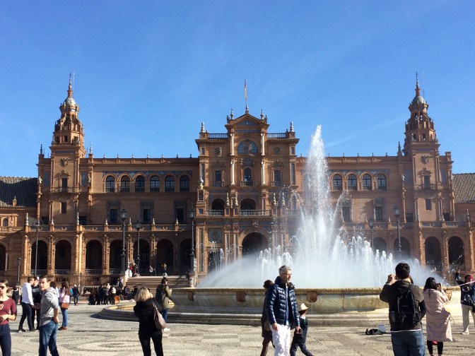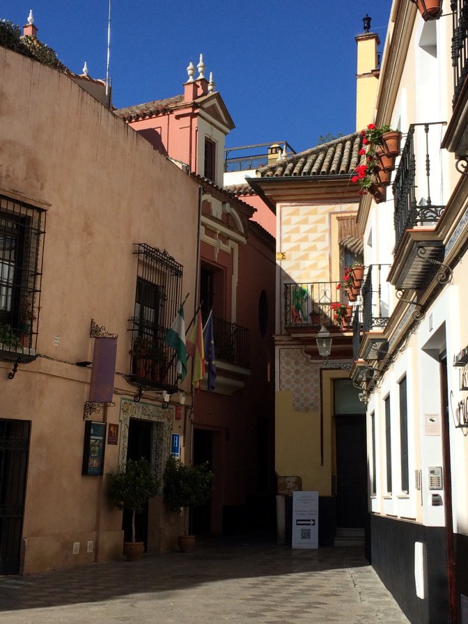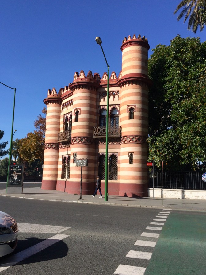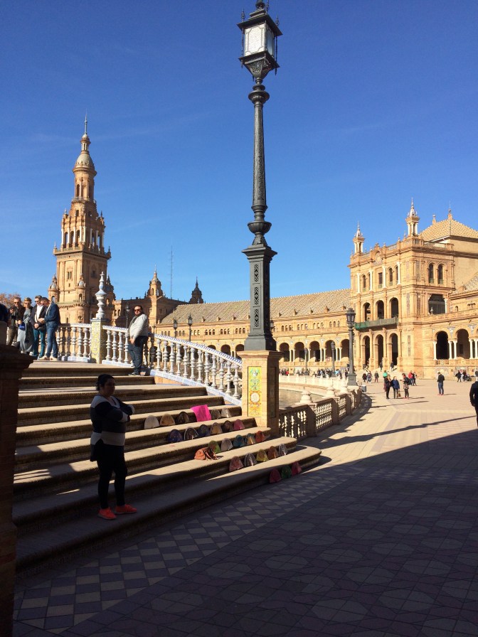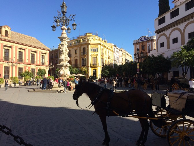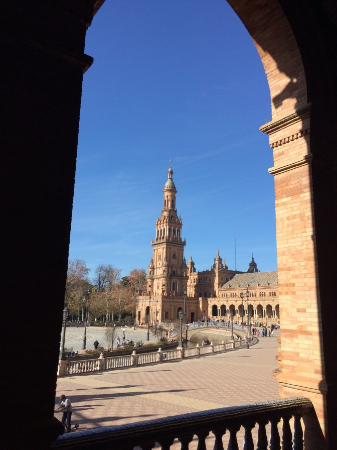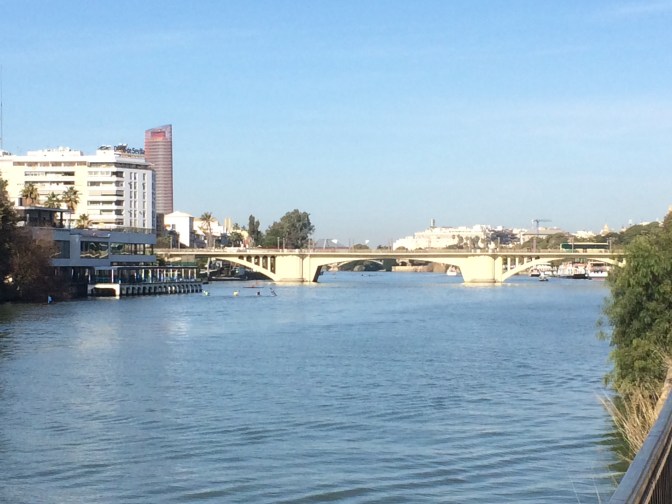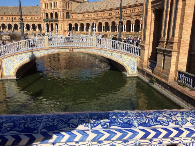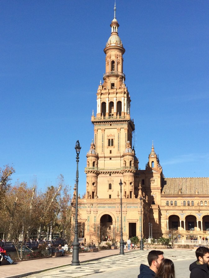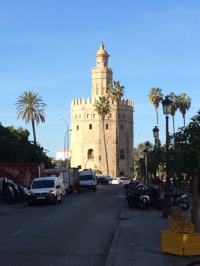 Since Courtney had to return to England for work we opted to take the coach from Cádiz to Sevilla (1:45 Hrs) and have the day on our own. Although the start of the day was cool it became a hot sunny day and we took full advantage walking some 6 miles around the town. On the ride to Sevilla, the guide gave us maps and a list of the more important places to see which were (in no particular order) – Real Alcazar [Moorish Palace] (12th to 19th Centuries), Palacio de San Talmo [San Talmo Palace] (18th Century), Capilla de Santa María Jesus (16th C), Museo Marítimo Torre de Oro [Gold Tower Maratime Museum] (13th Century), Catedral y Giralda [Cathederal and Bell Tower] (from 15th C), Iglesias de Santa Cruz (17th C) [Church of the Holy Cross] which is in the heart of the Old Jewish Quarter and a area number of narrow streets and restaurants, Plaza España [Spanish Square] (20th Century); The Plaza de Toros Real Maestranza de Caballería [Bull Ring] (18th C), and the shopping area around past City Hall on Constitution Avenue near the 17th Century Church and convent of the Holy Angel.