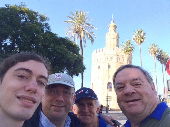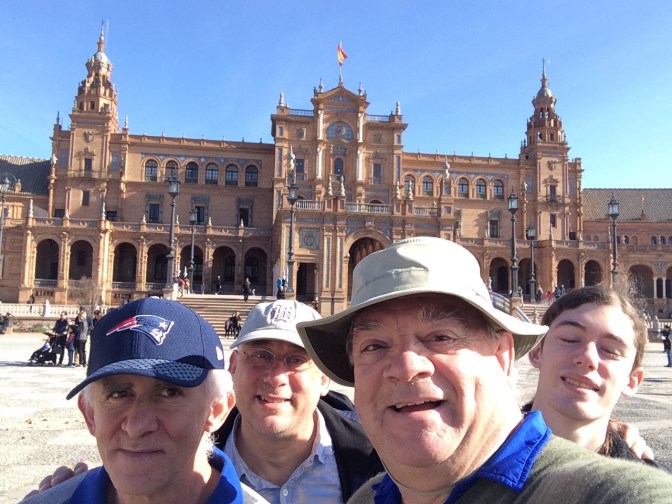 When we arrived in Sevilla, we were dropped in front of the Alfonso XIII Luxury Hotel and went straight to the Moorish Palace – Real Alcazar. However, the queues were so bad that it would have taken us over an hour to get to the ticket office and Courtney had to leave within the hour to the airport. So we sadly bid her adieu as she took the flight to Gatwick and home to Wokingham. Once she left the 4 boys, headed to Starbucks for a coffee and thus fortified, headed out to the river – Canal de Alfonso XIII passing the Bull ring, and to the first stop – The Museo Marítimo Torre de Oro. However, as we were still carrying our coffee and no drink is permitted in the museum, we continued the walk along the river where there were various 2, 4 and 8 men skulls practicing on the river. When we got to the Puente de los Remedios, we took a left through the Maria Luisa park, along Avenida Rodriguez de Paso to the magnificent Plaza España, which was built for the World’s fair in 1920. Other countries also built structures and we passed on entering the city, the Mexico, Colombia, Guatemala, USA, Brazil and others on the Avenida de Delícias. It is a magnificent semi circular structure with a central fountain and a moat like structure permitting small boats to row in a full circle around the area. We then wandered up the the Old Jewish neighborhood and stopped at a little sidewalk cafe for a real home cooked Tapas meal at the Casa Placido Restaurant including Cola de Toro (Bull Tail), Spanish Omelet, Chorizo, Goat cheese all going down with a glass of local beer. We then continued along the narrow streets eventually getting to the Cathedral, which from the outside is magnificent. We tried to enter and stood some 35 minutes in the queue to pay the entrance fee, as we still were not at the kiosk, we opted to leave as we only had half an hour before we had to be at the meeting point for the return coach ride at 3:30PM. We went in and saw the Alfonso XIII Hotel and eventually boarded the coach, returning to the ship in time for dinner, the Pub quiz and the “La Danza “ (dancing) show.