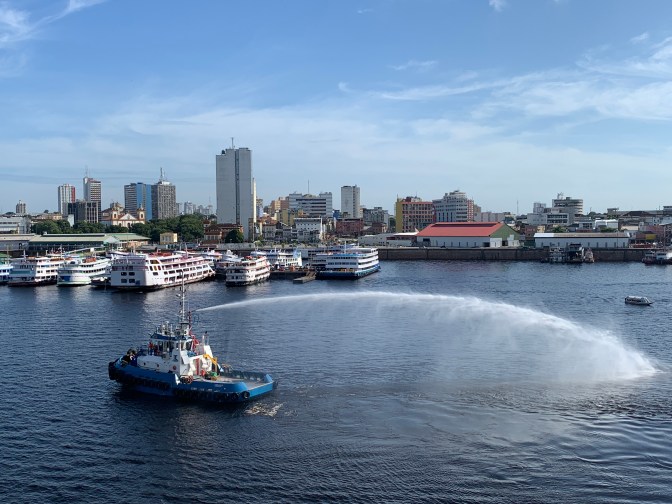 As we approached the mooring, great fanfare took place. Fire boats sprayed water spouts welcoming us, a local band of musicians and dancers serenaded our arrival and a warm Brazilian welcome was given. Not too many large passenger vessels arrive in Manaus, but there is extensive river traffic including “bus” boats that run all the way to Belem at the mouth of the Amazon and take 5 days. Some 10 floating petrol stations, different oil companies, were in the river to provide petrol / diesel to the ships.
