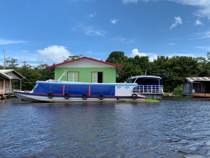 Once the Ship tied up on the large floating dock, starboard to shore at 9am, we got off and met up with our guide Marianne, who took us to the small metal, covered motorized canoe with seating for about 8 people. The four of us, the good English speaking guide and the boat captain / owner Sebastian, on our adventure for the day. We could see other passengers getting onto larger vessels for their experience in the Amazon.