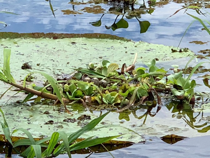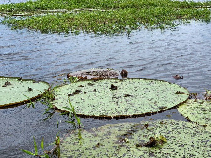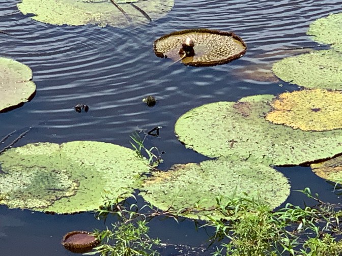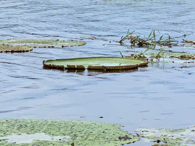 The south west shoreline is bordered for 50 miles by a vast floating marsh, which is the home of the river people whose homes are built on rafts. The marsh has much wildlife such as South American alligators, River Dolphins, Amazon river manatees, Anacondas and a profusion of water birds and birds of prey. Also here are the Victoria Regis water lilies whose pads grow to 6 feet in diameter and are the largest species of water lilies in the world.