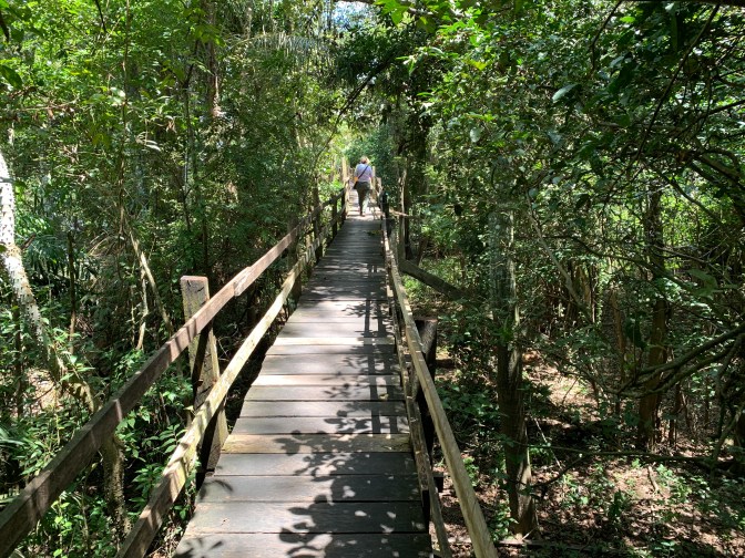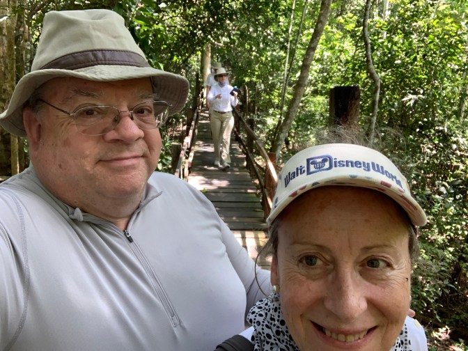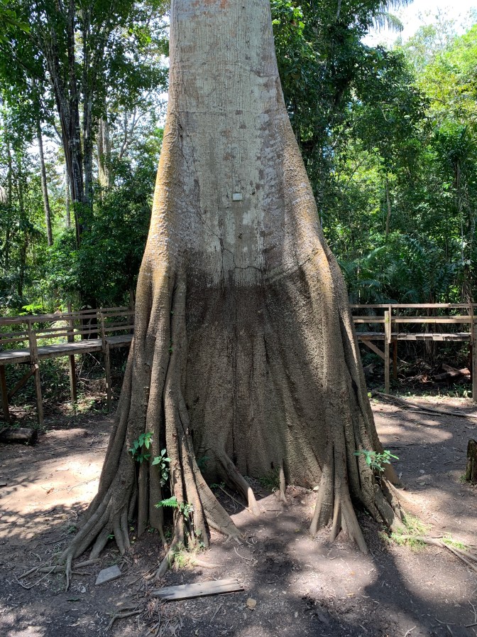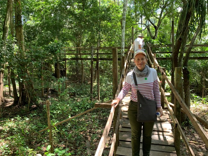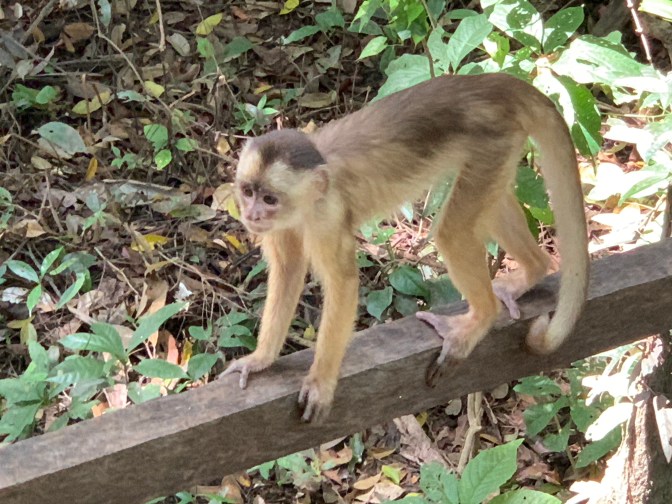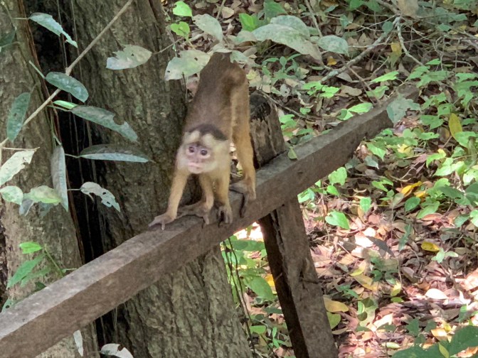 We continued the tour back up-River almost passing our ship and going up another tributary to Lake January which is an ecological park between the two Rivers. Once we got there we got off our vessel and walked for about an hour along an elevated wooden walkway about 30 feet in the air through the jungle we encountered different kinds of monkeys including a bright red howler monkey at the top of one of the ceiba trees. we eventually reached a viewing platform some 40 feet above water level where we were able to see the giant lilies and also a river alligator or Caiman who was just eating his meal of fish. While on this viewing platform we had a monkey visitor who was trying to get into our bags in search of food. Apparently the guide had a banana for her lunch in her backpack which she had put into double plastic bags yet the monkey was able to smell it and go after the banana.