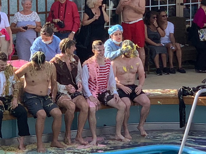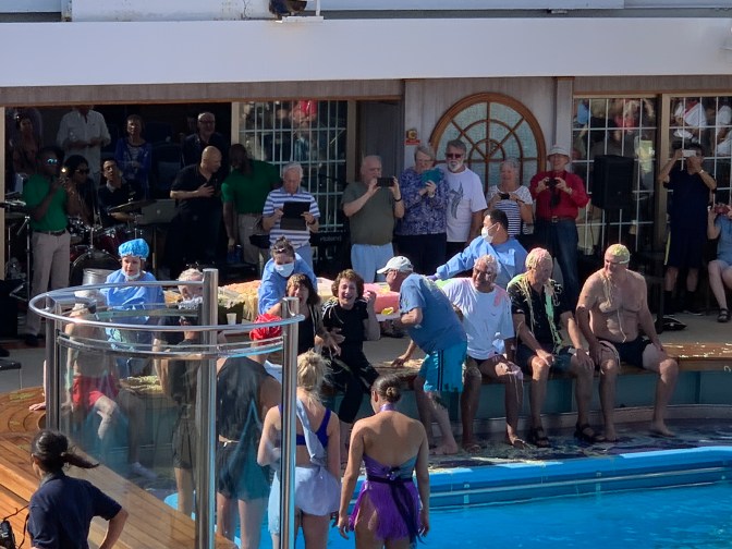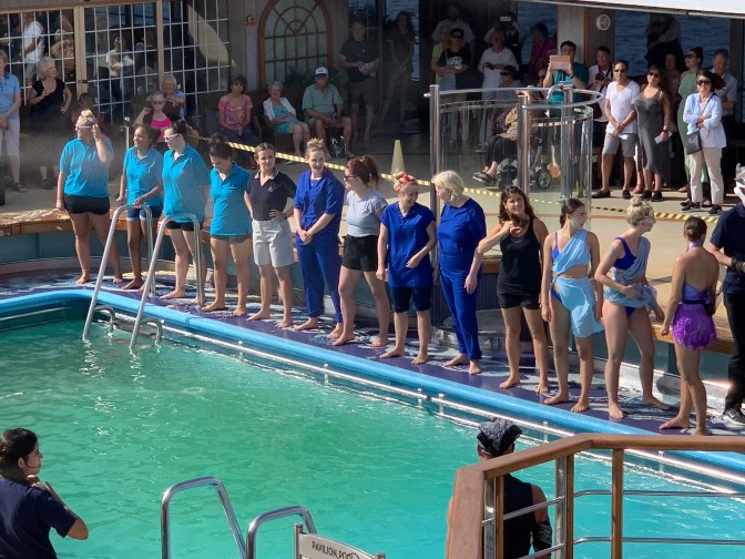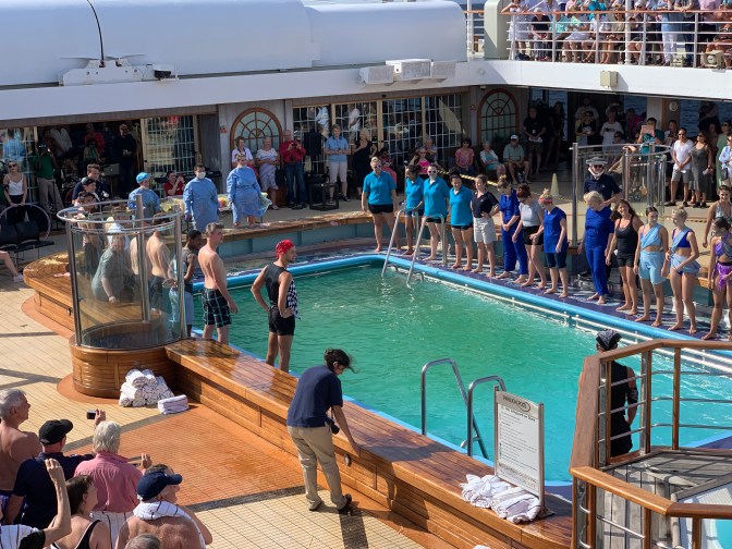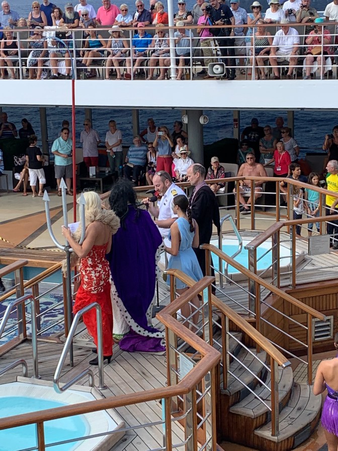 The always amusing “Crossing the Equator” ceremony took place in the afternoon where Pollywogs (those who have never had a Maritime crossing of the Equator) are converted, after due “punishment” into Shellbacks (those who have). King Neptune of the Deep, his Queen and Seaweed Court presided with the judge. All are found guilty of such major infractions as pushing more than one lift (elevator) button or taking extra chocolates from the cart of the cabin steward. For these crimes, the individuals are punished by having “slop” (scraps of unwanted food from prior meals) placed on their heads and bodies and rubbed in. All takes place in front of the cheering crowd, before being they are thrown into the swimming pool. Some dozen male and equivalent number of female pollywog members of staff in addition to the “slop” bath, also competed in a couple of tournaments. 1) Passing a hula-hoop along the line and back of the group of people all while holding the next person, arm in arm. One needed to step through it without breaking the arm-in-arm. The women won. 2) A swimming relay race the length of the pool of 5 people (3 at one end and 2 at the other) wearing the overall of the engineers. The same overall had to be put on before the lap, then with it on, swim the lap, then it is taken off for next contestant to put, on at each end of the pool. The men won.