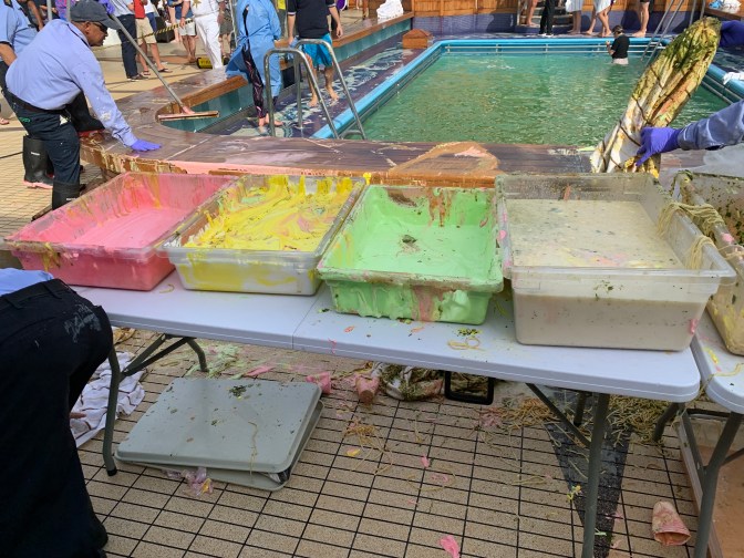 Then all remaining slop was put on the staff and into the pool.