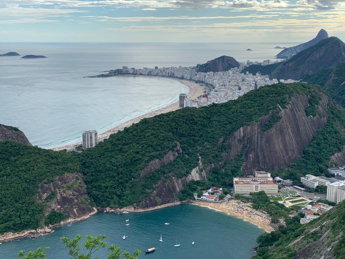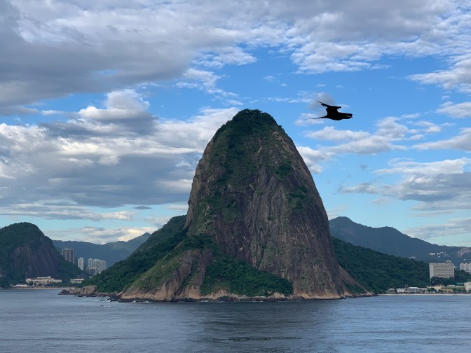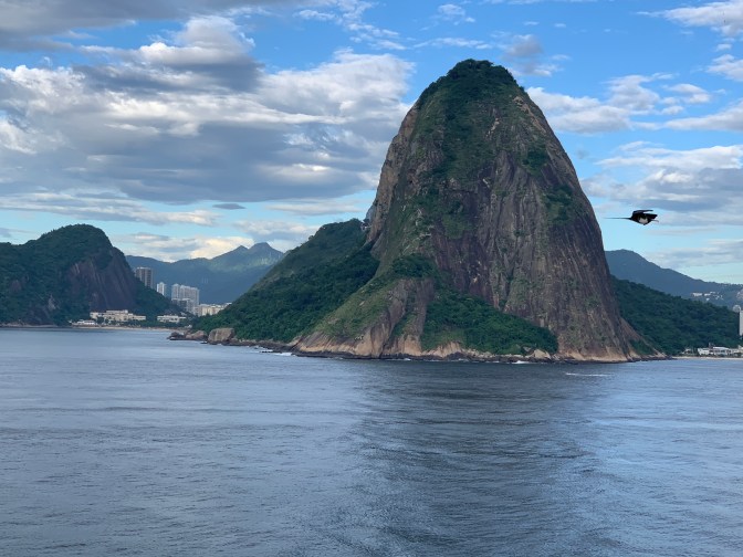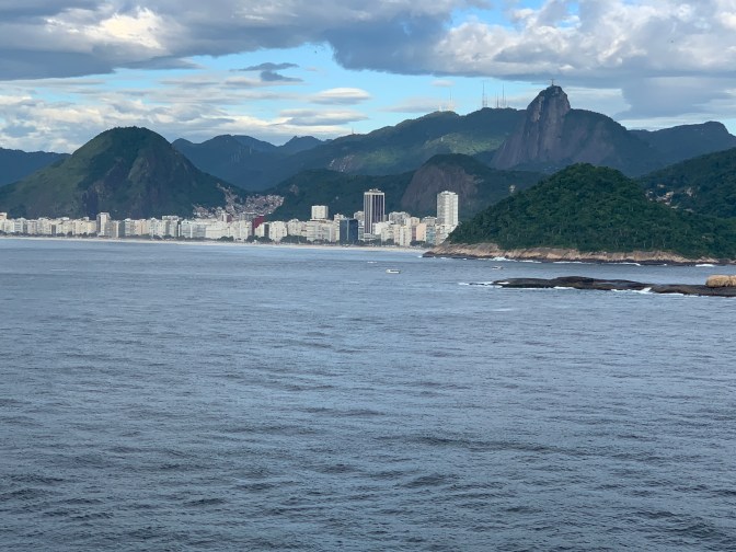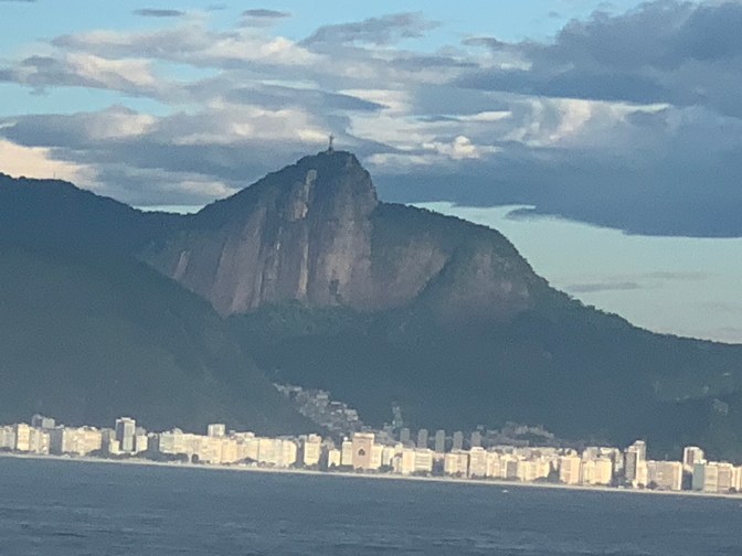 Entry into the Rio Harbor is one of the most spectacular seaport anywhere in the world and worth getting up early to experience. The only other bays I have visited of similar beauty are Sydney and Hong Kong. The initial approach was directly towards the harbor followed by a 90° turn to starboard for an amazing view off the Port side of Leblon, Ipanema, Copacabana, Botafogo bays and eventually into Guanabara Bay, keeping Corcovado / Christ the Redeemer statue in sight and passing right behind Sugarloaf (Pão de Açúcar) mountain. The cascading mountains, tropical vegetation and golden wide beaches on the South Atlantic Ocean make it a spectacular sight never to be forgotten.