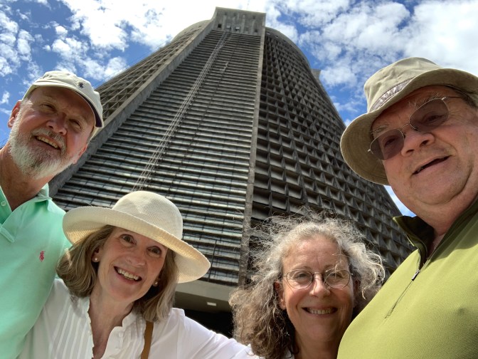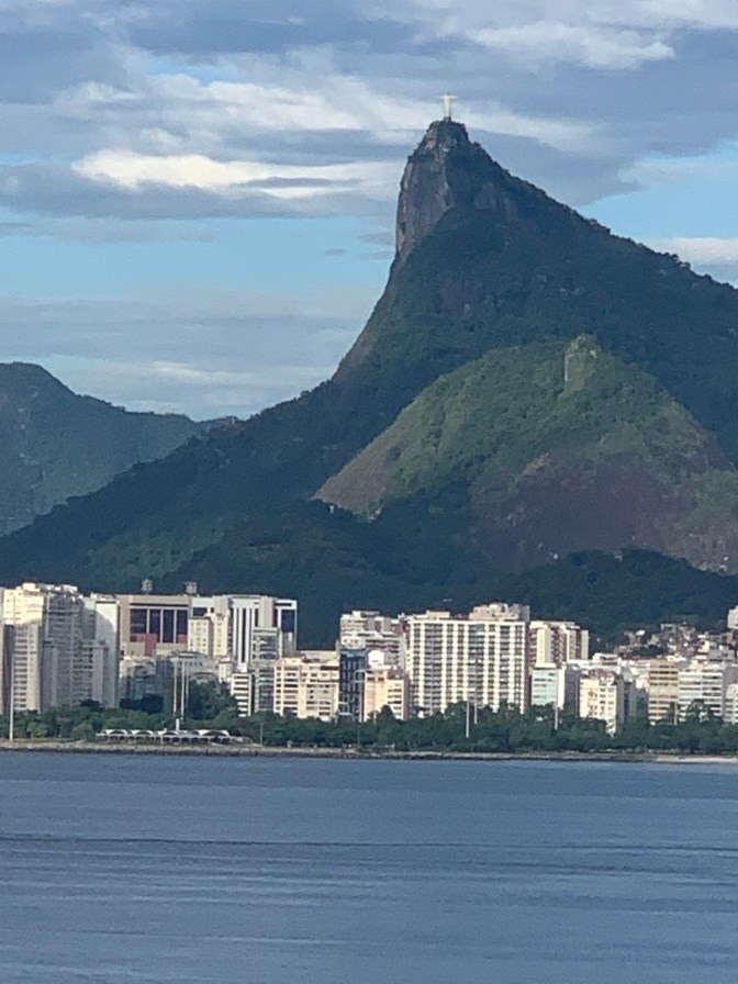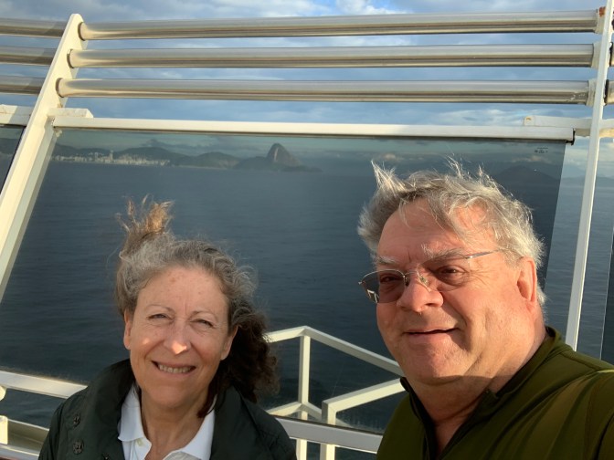 A very early start to the day as we were up on the balcony by 5 AM watching the sailing into the Rio de Janiero Bay and eventual mooring of the ship in Guanabara Bay where we will remain for two days. Thus is in the Mauá Port and Square Area, near the Museu da Amanhã (Museum of Tomorrow). While the driver – Helcio Fraga (a local DJ in the clubs and private tour guide friend of our driver Luis from last visit +21-98255-9633 & +21-98611-1340 fragatour.fio@gmail.com) had suggested we meet at the Mauá Square. The ships usually dock along the 5 or 6 Almacem (warehouses) and the Square is past #1 and we docked between 4 and 5, so it was about a mile walk, but we made contact and enjoyed 2 excellent days with him. He speaks Spanish and was an English guide to the US Olympic Team in the Rio Olympics.