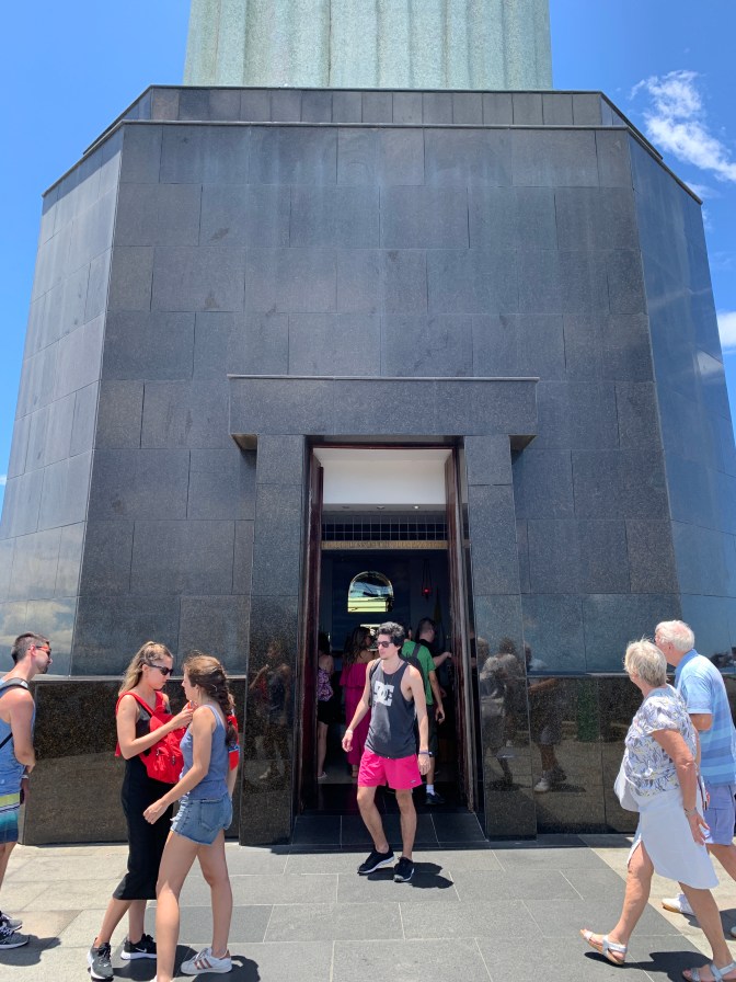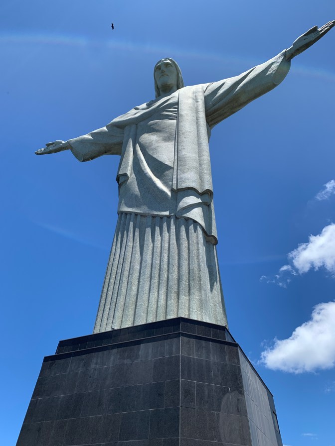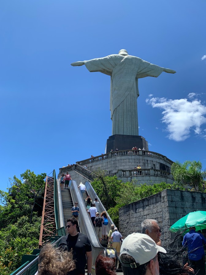 We made our way to one of the “must see” sights of Rio – The Statue of Christ the Redeemer on top of Corcovado (hunchback) mountain in the Tijuca National Park. There are various methods of reaching the top, but the best is the Corcovado Train. Others are Walking, a long way to the top of the 710 meters (2,330 Ft) mountain, or you can drive to a certain point then walk, train or minibus, or take a mini-bus to the top. The first time I went up some 40 years ago, I took a taxi to the top – which is no longer permitted! This time though, The train trip we took, is best booked and paid in advance as when we arrived at 11 AM, the next available slot was 1pm, which would have required a long wait. A word of warning here. I booked and purchased tickets for “Senior Citizens” as the four of us were all over 60. When we arrived at the ticket office, they demanded to view the credit card with which I had paid and the official photo ID that I had said I would present when exchanging the coupon for the actual bar coded tickets. It was somewhat of a surprise that the ticket collector said, that rate was only valid for Brazilians and thus we had to pay US$75.00 more to get onto the Swiss made funicular / cog-train. A big surprise!!! Nevertheless, the View of City from the top and the forest that you go though getting there, made it all well worth while. The statue itself, with it’s chapel at the base is enormous. It was completed in 1931 and is 125 feet (38 meters) high and weighs 1.145 tons. One can see the lakes, horse racing track, all the beeches, Santos Dumont (downtown) airport and indeed virtually all of Rio.