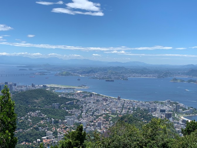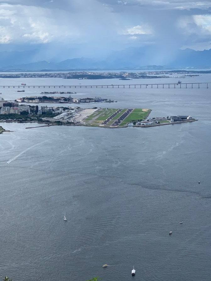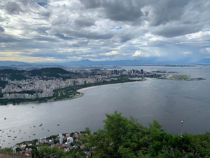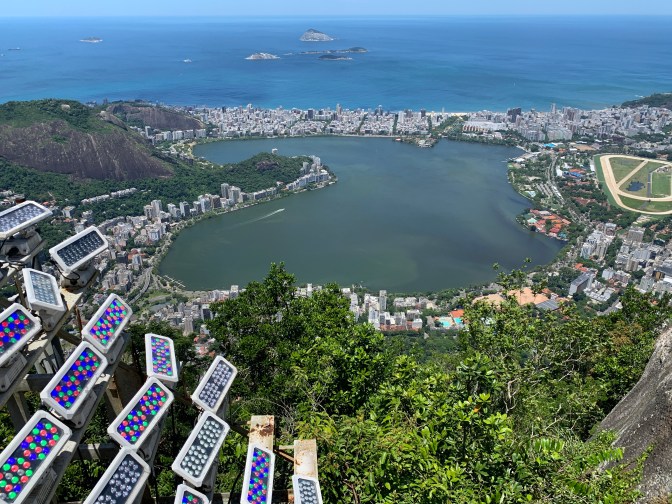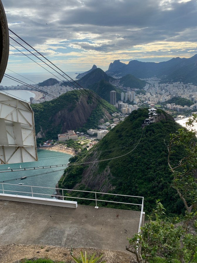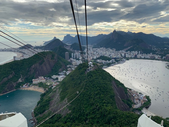 After a delicious lunch, we took the short trip to Pão de Azucar (Sugarloaf Mountain). This gives you the opposite perspective from Corcovado. Namely, Corcovado is behind the city looking out to sea and sugarloaf is an island in the bay looking back at Rio and in the background – Corcovado. This granite “rock” rises to 1,293 feet (394 meters) out of the water. The summit (originally climbed by an English Woman in 1817) is reached by two – 3 minute cable car rides. The first, leaving from the military Neighborhood around Praça General Tibúrico just off Avenida Pasteur take you to the summit of Morro da Urca at 715 feet (218 meters) high. A brief walk, past shops (Lojas) and eating places, brings you to the second cable car which takes you the remainder of the roughly 500 feet to the summit. Tickets can be purchased at the machines at the base and different options are available depending on how “fancy” / VIP you want to get. If you have a fear of heights consider well whether you want to go the whole way. It is easy to observe the start and end of the first ride as it is over the park. The second, seems longer and steeper and is over water. Each Gondola carries 65 people plus operator, so if you feel a bit uncomfortable it is easy to stand in the middle and look down at the floor while the car is in motion.