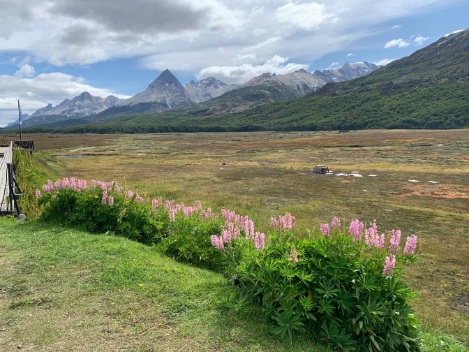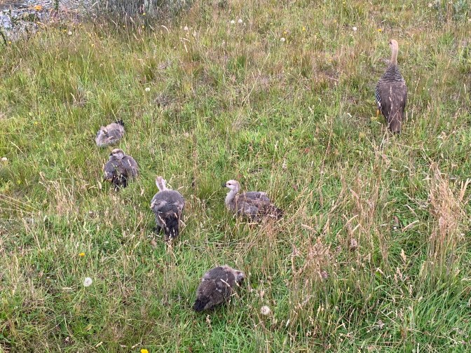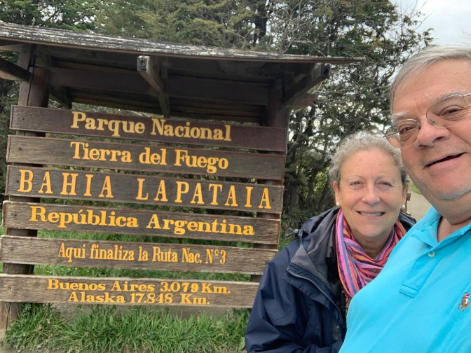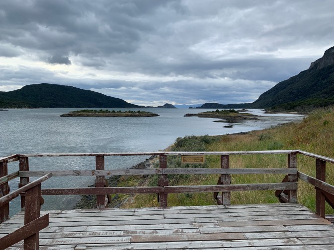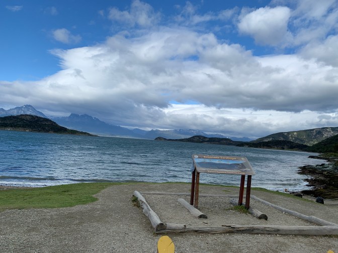 We went left (West) off the pier past The 1913 Casa Beben, taking some back streets so as to try and beat the coaches to the park at the end of the world. The 63,000 hectare – Tierra del Fuego National Park (as the “End of the World Park” is called) can be reached either by a tourist train going most of the way there, followed by a mini-bus, OR a drive from Ushuaia for 12 kilometers on mostly unpaved roads which form part of the “Pan-American Highway” that starts in Alaska. Literally, the highway ends and there is water! A sign stating “The Malvinas / Falkland Islands are Argentinian” is the first thins you see. Also a sign, in Spanish, saying:- “National Park of Tierra del Fuego, La Pataia Bay, Argentine Republic. Here finishes National Route 3. Buenos Aires 3079 Kilometers / 1913 miles and the start of the road in Alaska – 17,816 Kilometers / 11049 miles)“. The scenery is gorgeous with the various inlets and mountains. The River Lapetaia meets the Lapetaia Bay at this point. We were lucky as we were the first ones there so we had the place to ourselves. On the boardwalk, leading to a pier known as Port Arias, constructed over the bog, we saw a native bird family – parents and 4 chicks by the side of the walk and the serene beauty of raw nature was spectacular. A brown Owl like bird and other were close by, thinking there might be some food nearby. The area is an Archaeological site as a great deal of information can be obtained from sediment studies. The rotting vegetation accumulated at a rate of about 1 year being equivalent to 1,000 years of history. Some of these bigs are 10-15 meters deep, so should give us an understanding of live going back many Millennia. There was a large colony of Clams and Mussels visible in the intertidal zone. As we rounded the walk to turn back to the car, we encountered the first of many throngs of coaches arriving at the lookout point. The silence was broken, so it was time to move on.