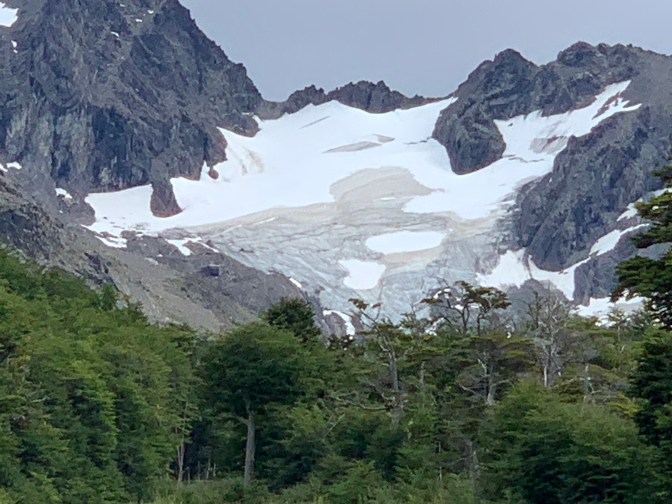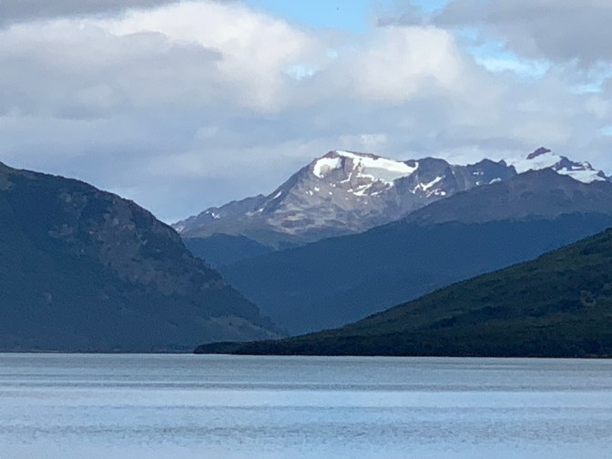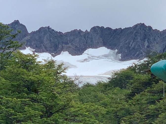 Returning to Ushuaia which is some 20 Kilometers long and only a few streets wide given the proximity of The Andes, we passed the Ushuaia Rugby Club (Established in 1982) and stopped at the “Parroquia Sagrada Familia” (Sacred Family Parish) in the middle class Neighborhood. While the main church was closed we were invited to sit in the small chapel inaugurated on May 1, 2010 open 24 hours a day, with Exposed host / perpetual adoration chapel of Pope JOHN PAUL II, which was very special. We then headed up the mountain to the Glacial Martial / Martial Glacier. Of interest here is that the Andes, which should run North-South as in Peru Chile etc but because the “West to East bend” of Tierra del Fuego, at the “bottom of the world” the Andes run East-West ant thus the town is actually on the southern side of the Andes. As we drove up the mountain to the glacier and the Refuge Café & Bar situated at the base of the glacier from which one can walk up about 2 hours to get to the ice. On the road up to “Base Camp” we passed some of the luxury hotels – Altos Ushuaia, Wyndham Garden Glacier Hotel and Las Vegas Ushuaia Resort. The largest Luxury hotel and newest of the lot was near the mountain pass we were to take past Olivia mountain. All these are on the mountain and have terrific views of the Beagle Channel and the Glacier. Perla explained that since she moved to Ushuaia 35 years ago, the glacier covered about 3 times as much of the Mountain and there is great concern as the glacier provides most of the drinking water for the city. On the way down we stopped for a brief moment at the “Mirador Camino de L.F. Martial” a view point with a fantastic view of the bay, the city, the airportand the mountains behind. At this point the Beagle channel (Onachaga in Yámana) is 15 Kilometers wide, but gets as narrow as 1 kilometer towards the Pacific side.