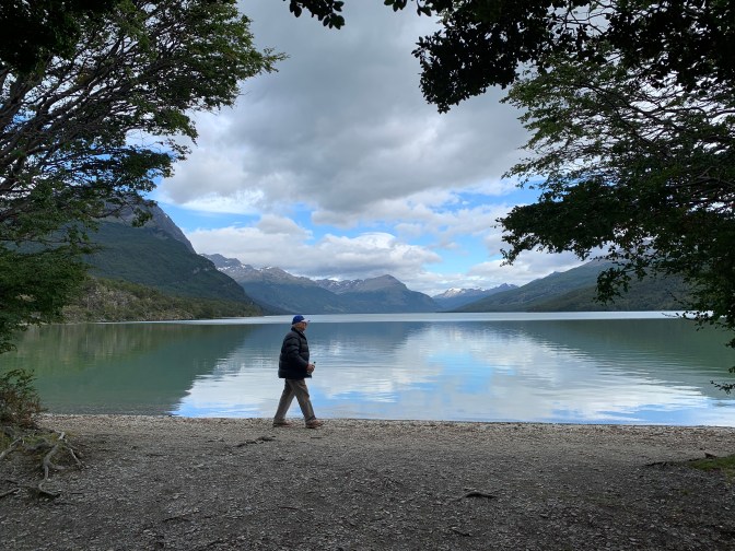 No visit to this area is complete without seeing Roca Lake or Lago Acigami in the native Yámana language meaning “elongated basket”, which is the shape of the lake. It is where the lake flows through a narrows leading to the Lapetaia River and to the lake of the same name. The guide explained about the three types of trees, two deciduous and one evergreen and the various plants and fruits growing wild. A “pit stop” for liquid exchange at the Alakush visitors center was a needed stop before heading to lake Ensenada Zaratiegui. A great view of a beautiful lake / estuary with the mountains riding majestically and the view of Isla Redonda, Chile’s Hoste Island, Iran point etc. We are barely a mile to the Chilean border.
