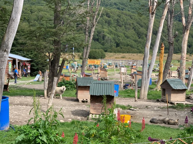 Next, after going back into town, we headed to the Eastern part of town. We were to visit the Olivia valley and travel over the pass behind Olivia Mountain (1326 meters, previously PaleoNunatak, but called Uliwala in Yámana = Harpoon Pointed Extreme) with it’s characteristic triple peak and razor sharp central peak coming to a sharp point and resembling a spear point. Two other mountains of note are Cloché which was covered by glacier and resembles a smooth topped muffin. The other easily discernible one is the Mountain of the Five brothers with it’s 5 sharp peaks. We travelled behind these peaks over the pass into the valley behind to the Garibaldi View point overlooking the “Lago Escondido” / Hidden lake. It is so named as it is often covered in fog thus not visible. Fortunately, we were able to see it clearly as it was a perfect day. On the way out of the Park, into the City and now on our way out of the city, we were stopped by police to review papers as well as seat belt use. The driver gets fined if all passengers do not have seat belts on, even in a coach. On the way through the pass we stopped at one of the two restaurants “Villa las Cotorras” that are used by the locals. This one has next door a Dogsledding establishment – Siberian Park (Sinerianos de Fuego Ushuaia – Centro Invernal “Las Cotorras; Ruta No 3 Km 3016; +54-92901-49519; siberianosdefuego@hotmail.com). There must be about 40 Siberian Huskies, each with their own huts and pens, and provide sled rides for visitors in the winter. Even in the summer there is a walk behind the dogs that is offered for ARG$800 (US$13) for a 50 minute ride. The restaurant has a separate hut where lamb (the traditional food of the area) is cooked. The lamb is sliced in half through the ribs and placed on a long skewer through it’s center and held out “butterflied”. The skewer is placed in a circle around an open wood fire for 4 hours and several are cooked at the same time.