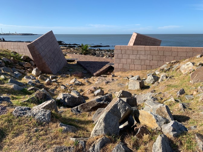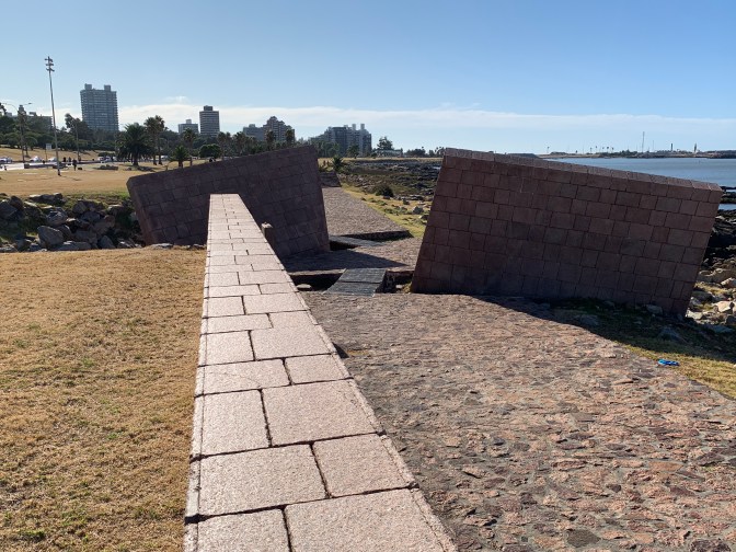 We immediately proceeded to La Rambla, which is the road along what appears to be the sea, but is actually the River Plate (actually Rio de La Plata = Silver River) because it is some 60 km wide at this point so you cannot see the other side which is Argentina. We travelled along the beaches which are on one side of the road and all the construction of luxury apartments are on the other side, so there is no construction directly on the beach. Our first stop was at the Holocaust Memorial – a brick wall structure by the river, emerging out of the ground as a straight line heading towards a brick wall to symbolize walking in a straight line hitting a brick wall so you had to go either to one side or the other, reminiscent of trains arriving at the concentration camps.