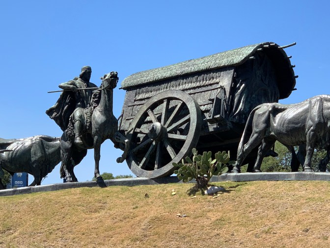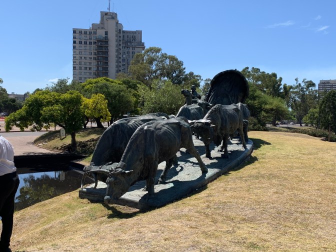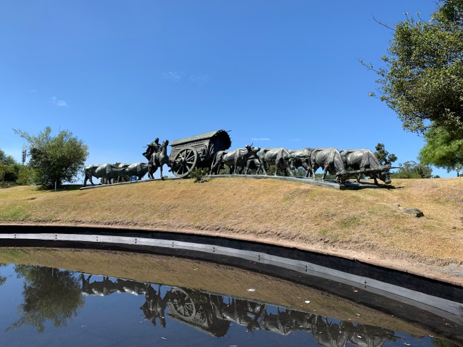 The statue of La Carreta, a must in all tours, is a statue behind a fountain of various oxen pulling a two wheeled cart over a road with one of the tires stuck in a rut. A man on a horse behind is guiding the group. Apparently The local artist made the sculpture in Clay, and as there was no local foundry the entire piece (some 30 yards long) was sent to Italy to make it bronze. At the time Mussolini liked the statue so much, he declared that it should remain in Italy. However, War was just breaking out and he had other more pressing things to think of so this statue was able to return to Uruguay.