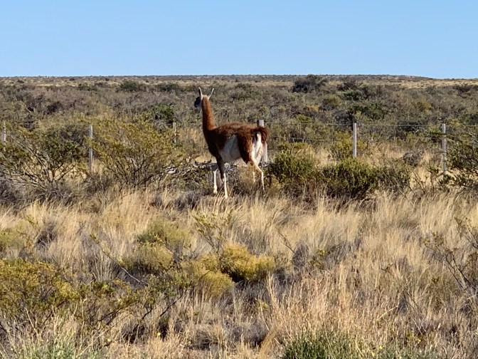 We headed down the long pier with nice beaches to the left and green algae filled braces to the right (between the Cruise port and the commercial pier / port) along the coast road (Av Guillermo Rawson) to Av. Kenneth Woodly / Route 1 to Route 2 past the Isthmus Aneghino to the only town on the peninsula – Puerto Pirámide. Just before getting to the Isthmus, we passed through a toll booth, paying the US$30 for a couple. At this point, the paved road became gravel and remained such all the way around until we got back to this point. In the area before and particularly in the isthmus (between the San Jose Gulf and the New Gulf – Where the ship docked) We were fortunate that we stared seeing the local wildlife. The first one was the Guanaco which is like a small humpless Camel / llama. It has no natural predators so the population is ever increasing and now numbers some 15,000 on the peninsula often referred to as the Island of Valdez, but is connected to the mainland.