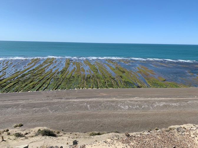 The second stop Punto Cantor on a promontory was one of the most spectacular natural views anywhere. Al low tide, we saw these finger like ripples of algae interspersed with water, rocks and sea lions. The ripple sand / substrata causes high and low long fingers at right angles to the beach, where the raised sections are full of green filamentous algae while the depressions still have water. It almost is like a river delta with the river (of algae) dividing into various rivulets As it reaches the ocean.