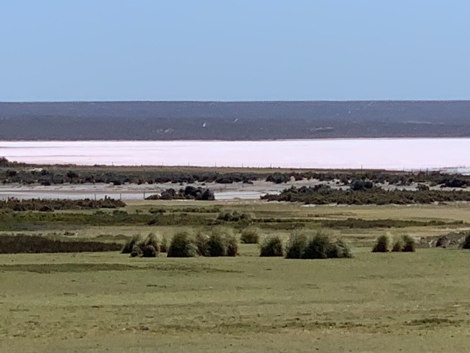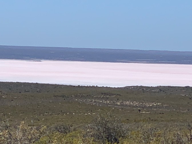 We went straight Past Punta Piámides (we saw several tour coaches there so wanted to get ahead of the crowds and see the places without a lot of people, which was perfect) then turned North (left) onto Route 3 towards Punta Norte but turned about half way there into Route 52 to Caleta Valdes bear the “El Salitre” Salt flat (6 meters / 20 feet below sea level). There are 3 salt flats indicating that the area at some point was under water. The sea water evaporated thus leaving the salt. Of the three salt beds, one is not usable as it contains a lot of nitrogenous minerals that are poisonous, but the others are pure salt (sodium chloride). At one point in history, this was the main industry as it was the only way of preserving food by immersing it in salt.