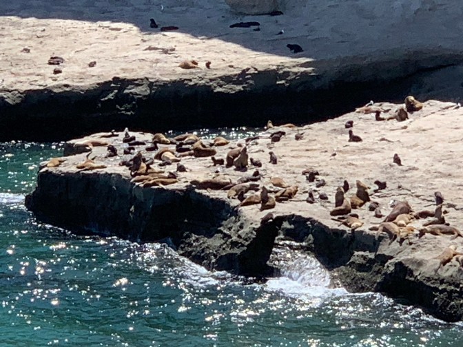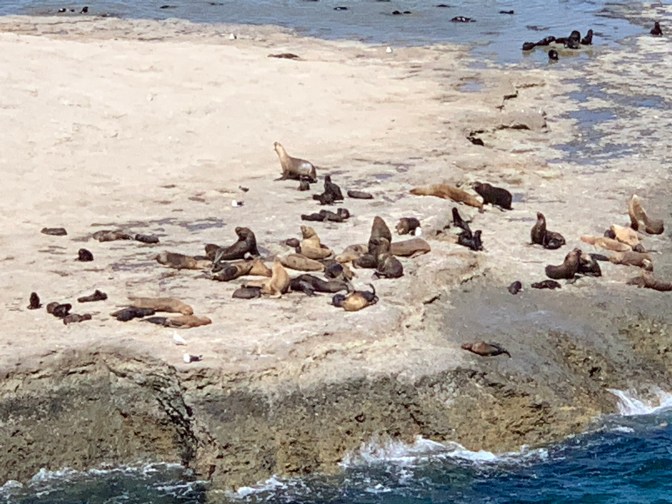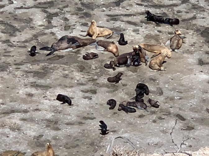 The pyramid point has a spectacular 270 degree view over the bay. Below the viewpoints are beaches which at low tide covered with seals, sea lions and sea birds. Large expanses of land are exposed and make a great gathering place for sea lion families. We saw various groups with their young.