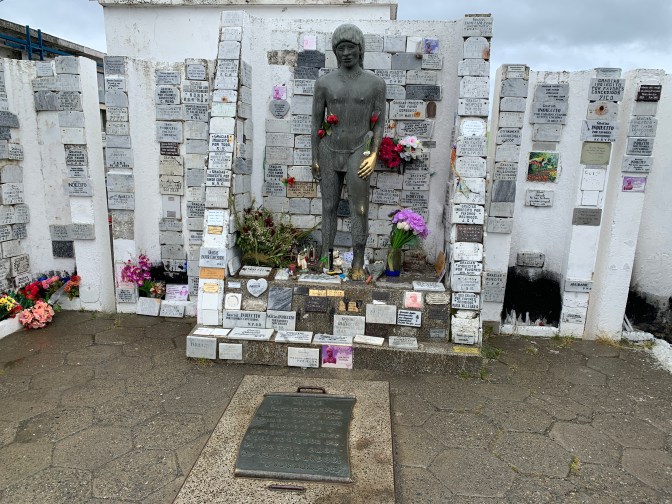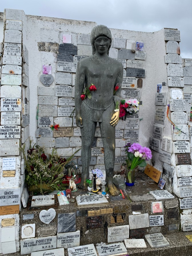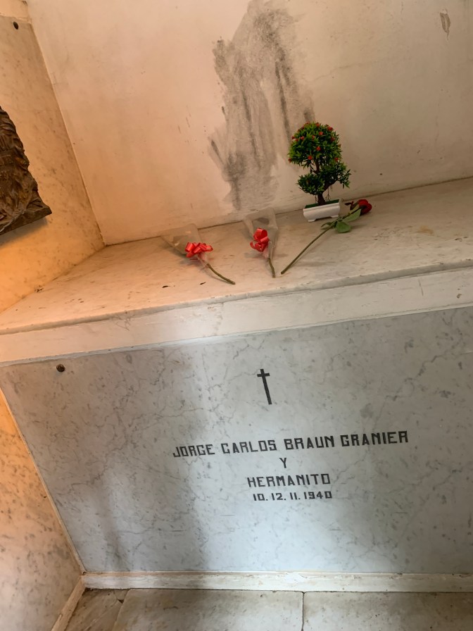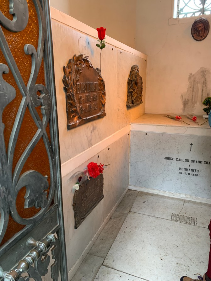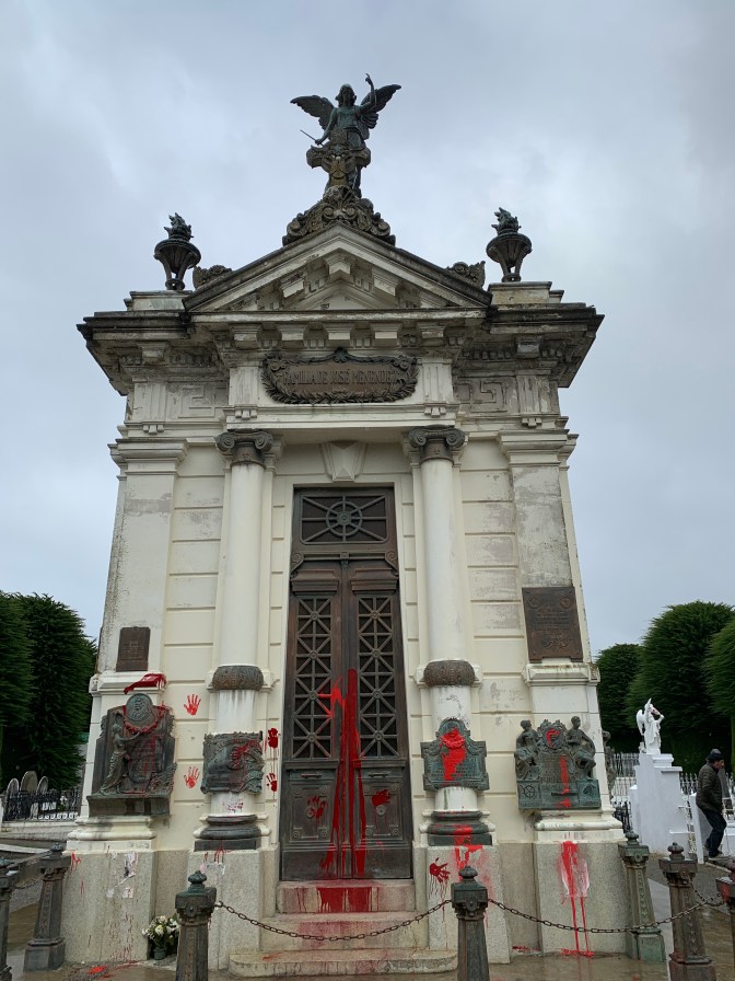 From here we slowly drove to the far end of town, periodically interrupting the name and date man, much to his consternation and confusion, to enquiry about a park we passed with dinosaurs, which we would like to have seen, but he dismissed as a child’s park. After one of these interruptions when we asked about the Cemetery that we had heard was important to visit, the driver turned around in the middle of the street and we proceeded to hear that the guide did not like to go to the cemetery because his family is hurried there. However, we did make it to the cemetery which is known for four major things. The mausoleum of the Ménendez family (which was defaced with red, blood-like paint, all over the exterior.