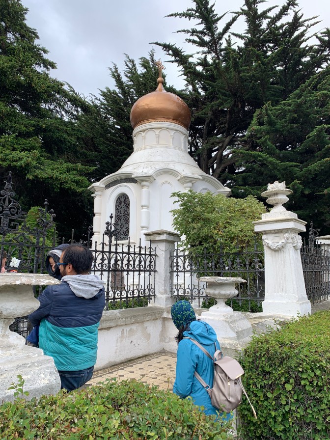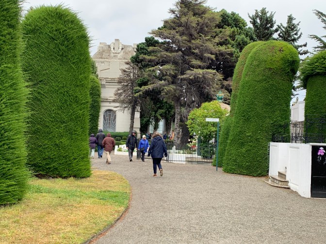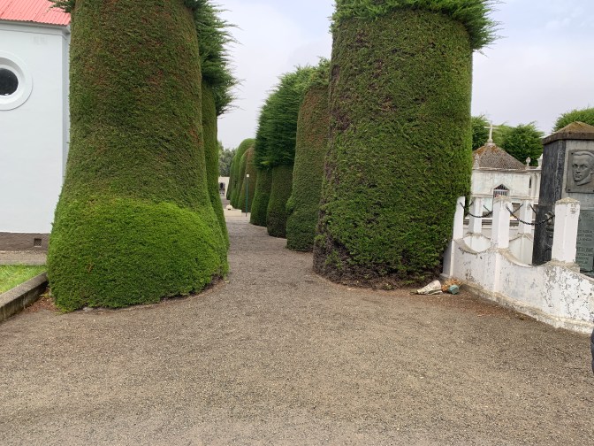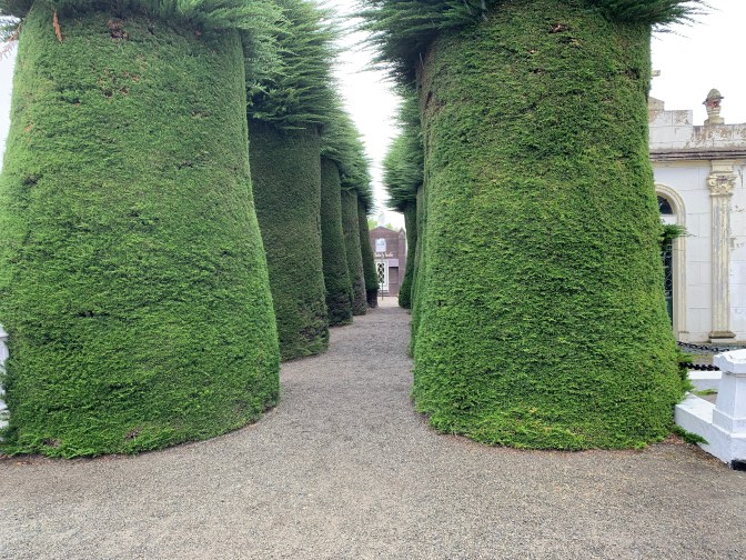The last one is the circular topiary cedars (arborvitae) forming long corridors between the graves. The tops of these trees are not cut off (we were told that it was for the safety of the people pruning) so it gave a somewhat comical atmosphere as if a wild teenager shaving the sides of his head but leaving the top wild and floppy.
