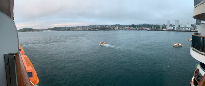 Eventually the Captain spoke and gave us the bad news that as the waves, currents and in general the weather, it would be too dangerous to go ashore, so all was cancelled and we would be reimbursed our expenses, but we needed to sail on to the next port, San Antonio (for Santiago). Various life boats / tenders were in the water and were recovered and soon we were off, out of the bay, back into the fjord and back out to the Pacific to continue our voyage North.