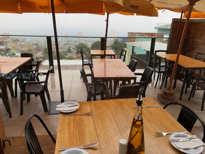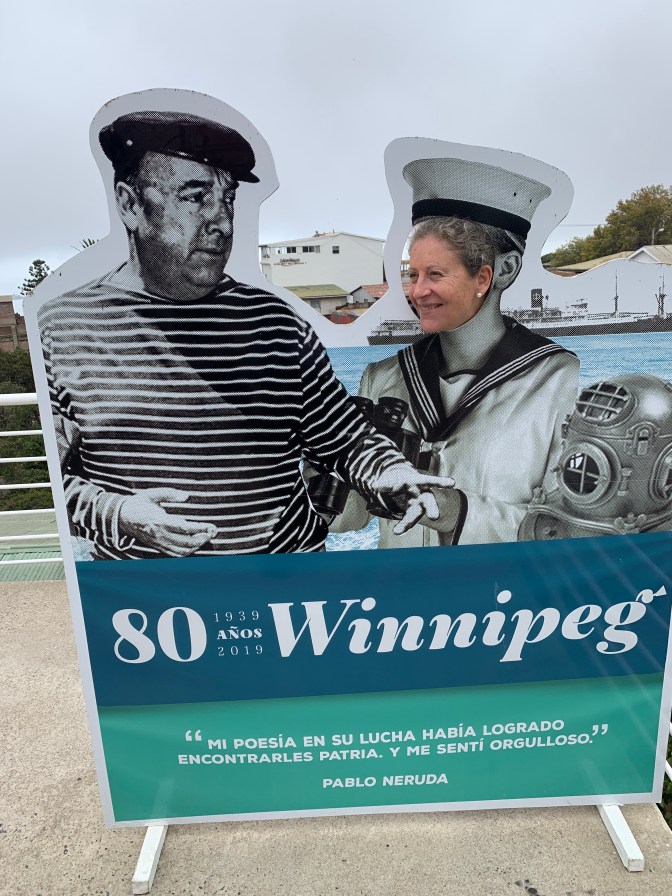 We continued our drive up the hill, and just past the Nobel laureate- Pablo Neruda’s home to our lunch place overlooking the town and bay. We had talked about the specialty, in this part of Chile and enjoyed our Machas a la Parmesana – razor neck clams in a Parmesan sauce. Pisco sour and good Chilean wine washed down the very good meal. The restaurant – California Orange Bar – on the corner of Florida and Condor streets is way off the better track but known by local tourists. I’m sure no-one from our ship was there!!! Next to the restsurant was a public lookout point and a square with life sized sculptures of the two Nobel laureates Pablo Neruda standing, chatting with another man seated in a bench and Gabriela Mistral looking off into the distance.