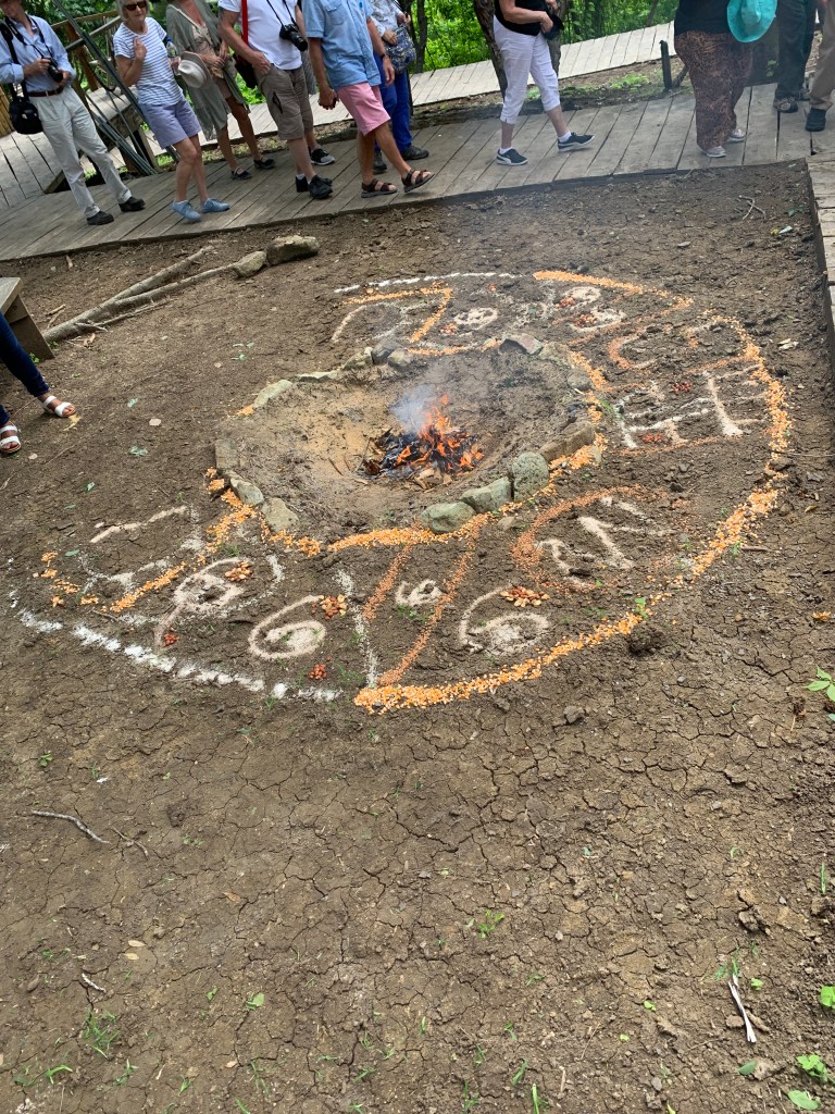 As we entered the site, clearly marked with a wooden entry portal, a local guide asked us to stand around a 10 foot wide mask drawn in the sand and using stones to delineate. A small fire was in the center. We all then had to grab a handful of what appeared to be sawdust from the sacred stick tree (Palo Santo) and throw it into the fire which lit up as if putting lighter fluid on an open flame. This was to appease the mountain deity before ascent.