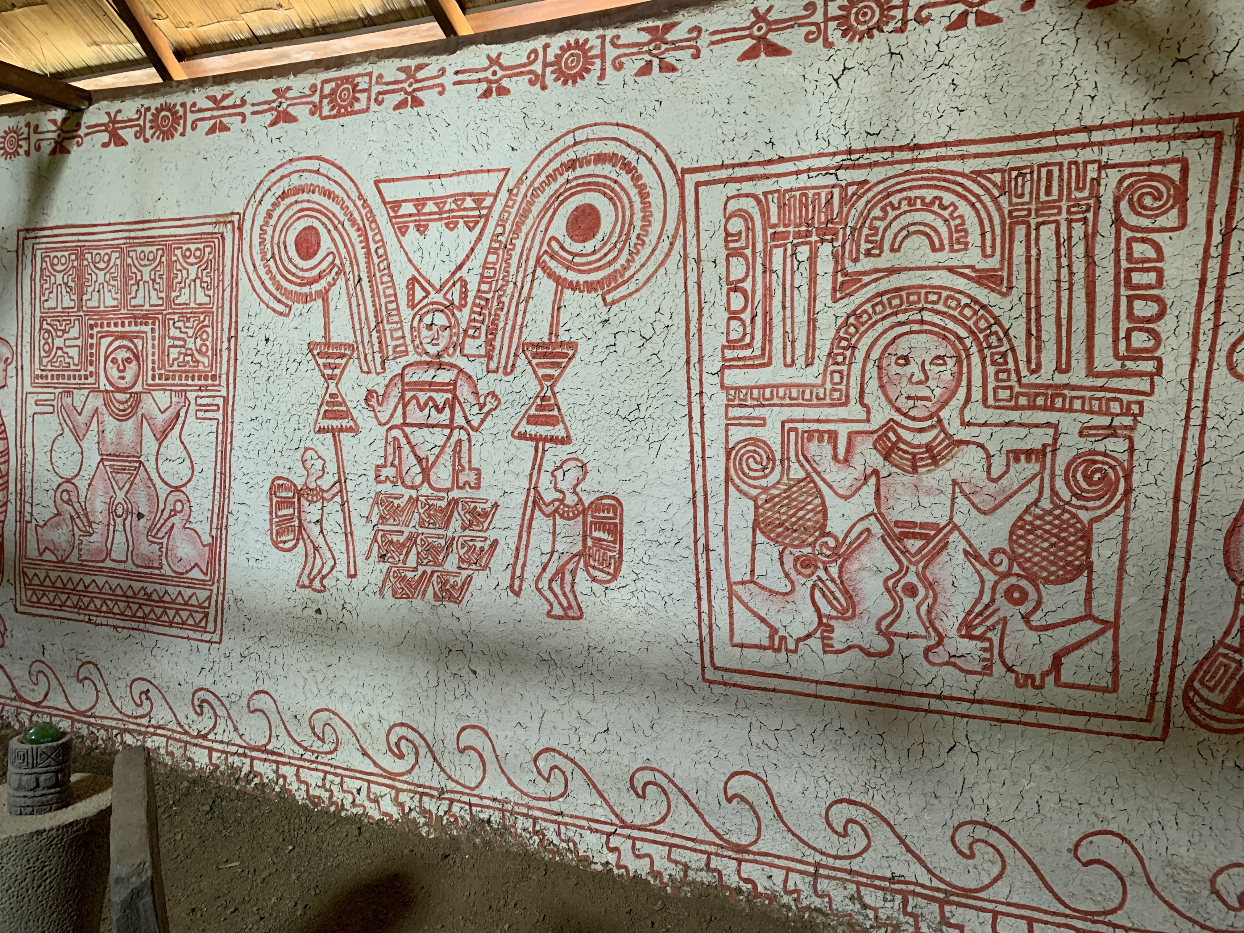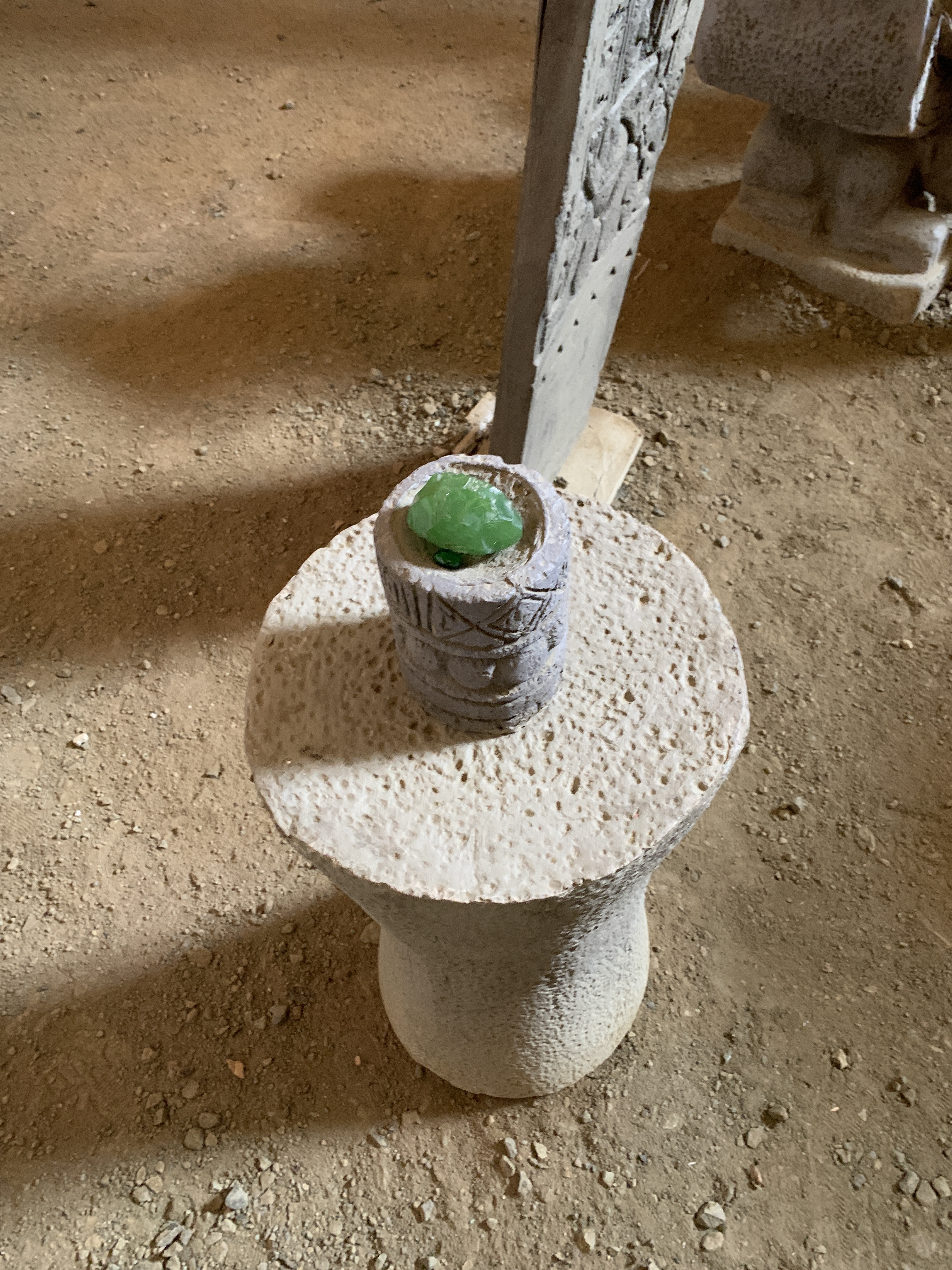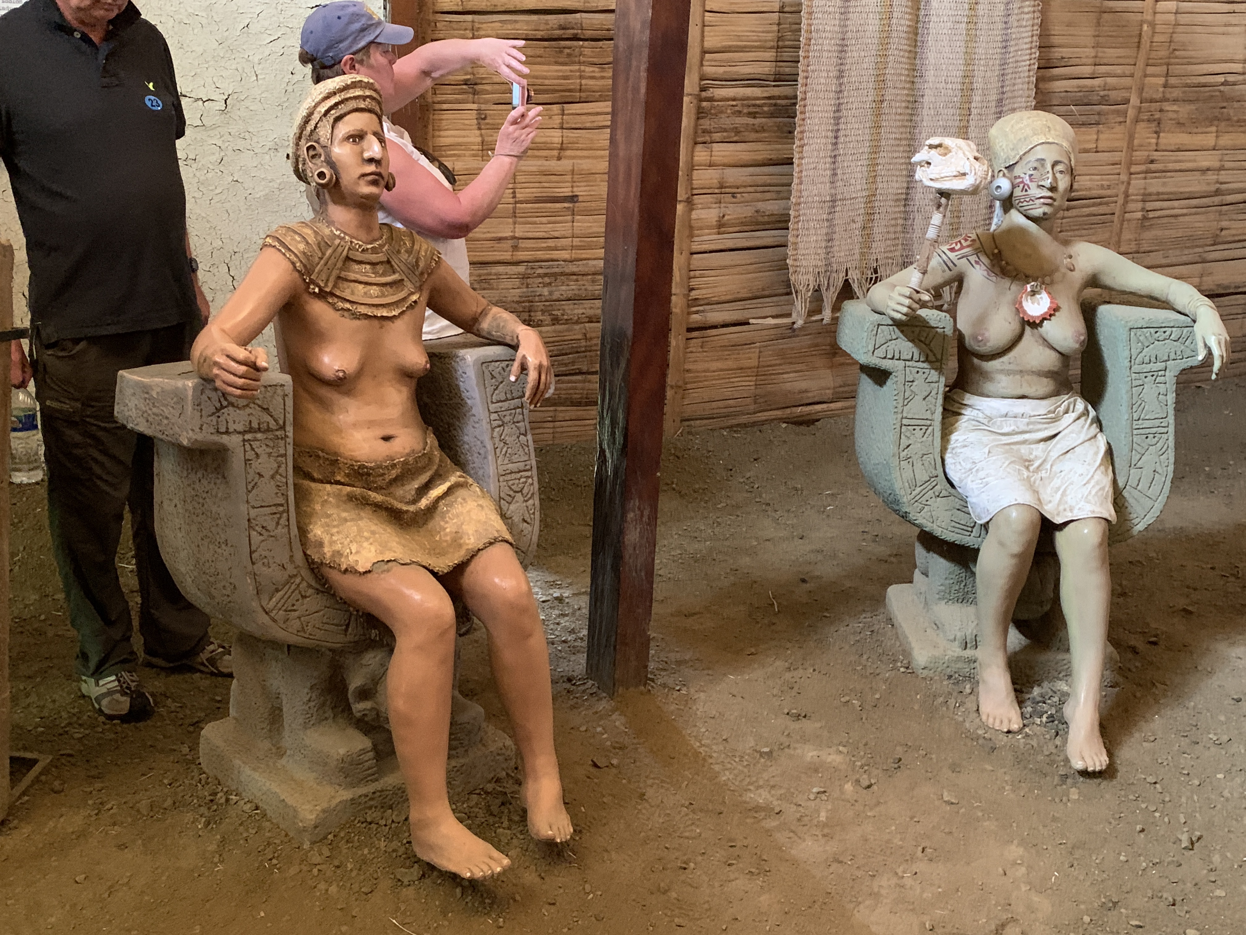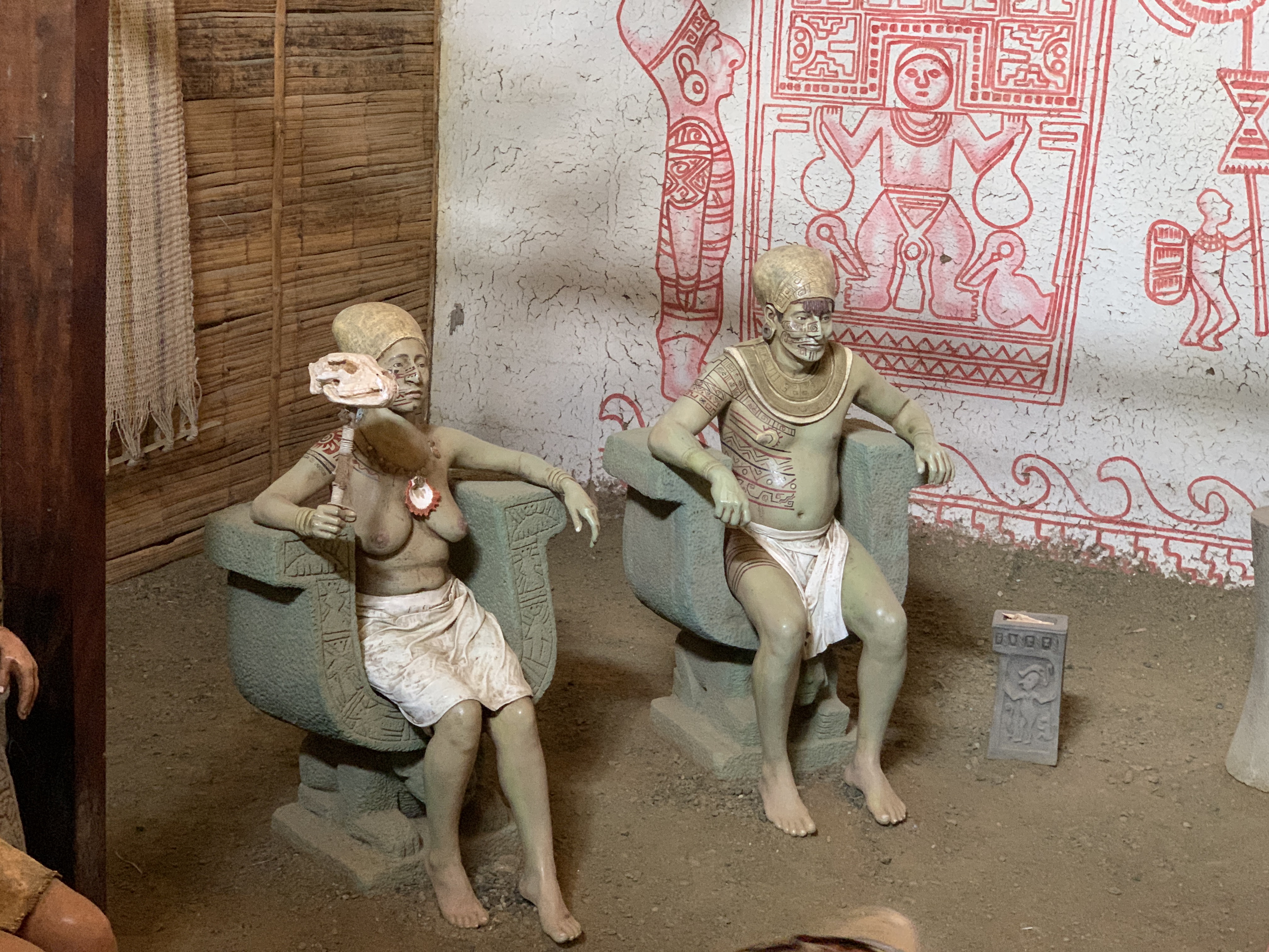 The second hut had the life size tattooed bodies of the leaders sitting in U shaped chairs (about 100 or so are currently identified) as if discussing important matters of state with the emerald green stone as if a mace or some other ritual objects in parliaments or government chambers today, indicating that the session is taking place.