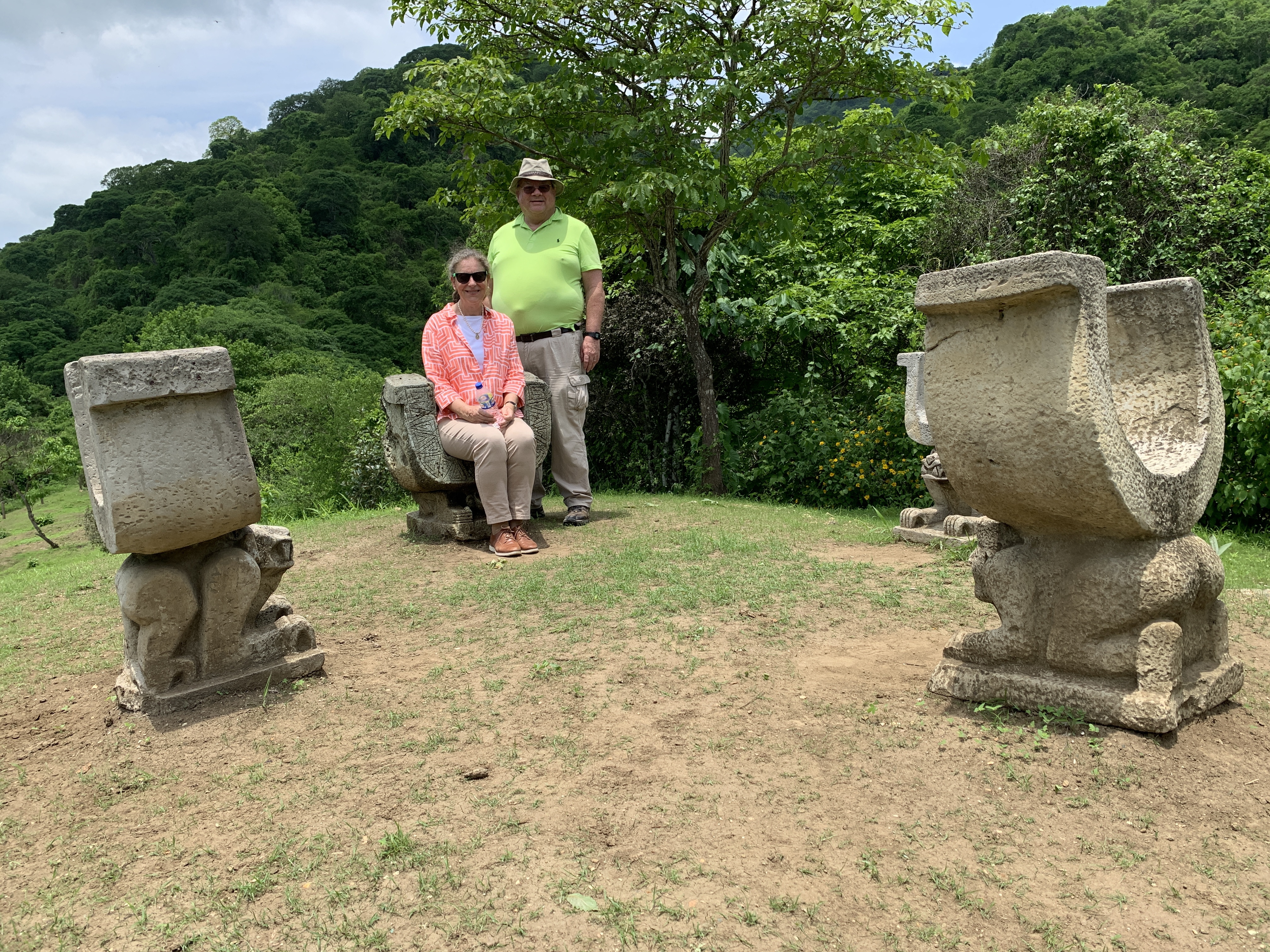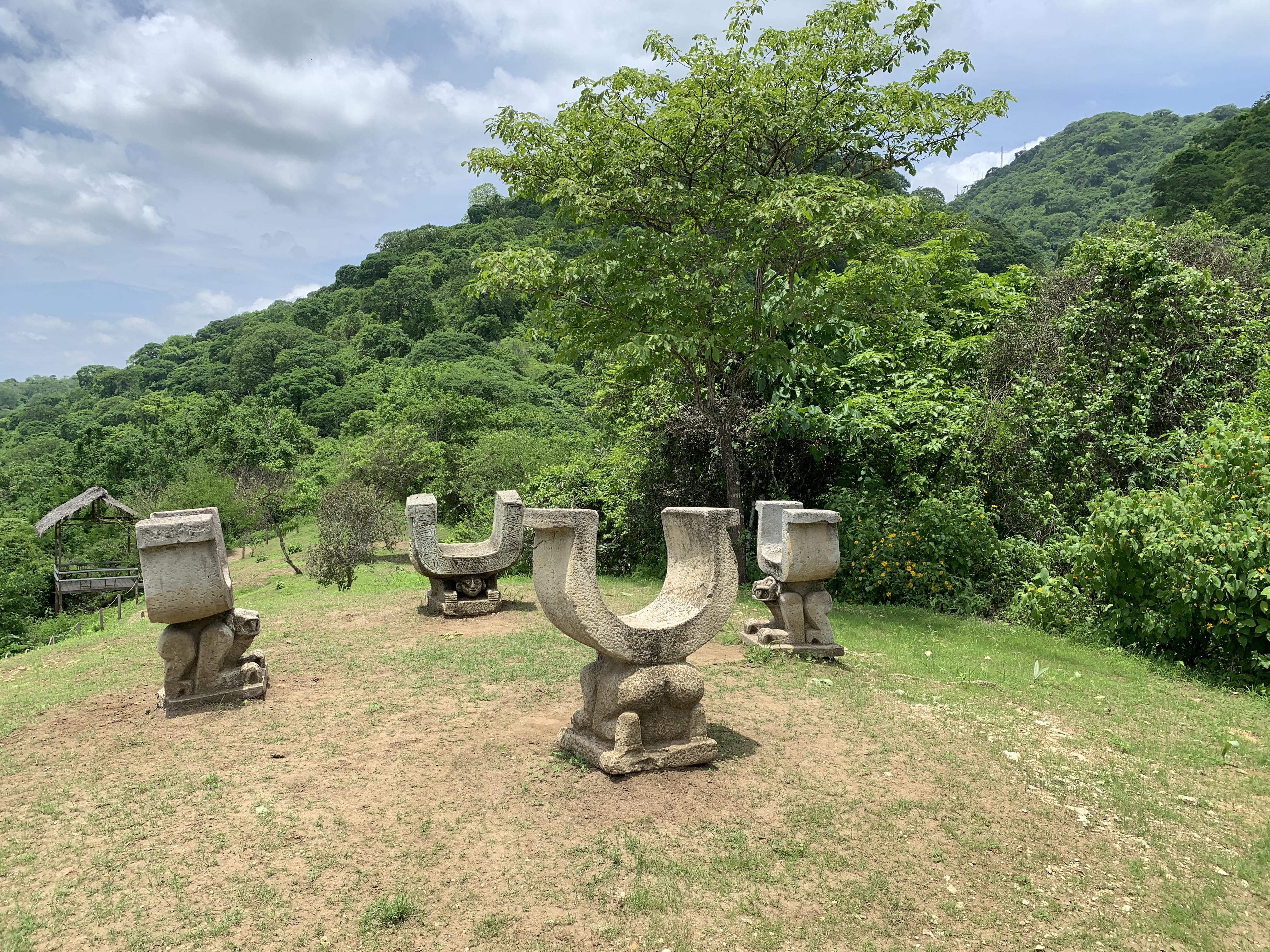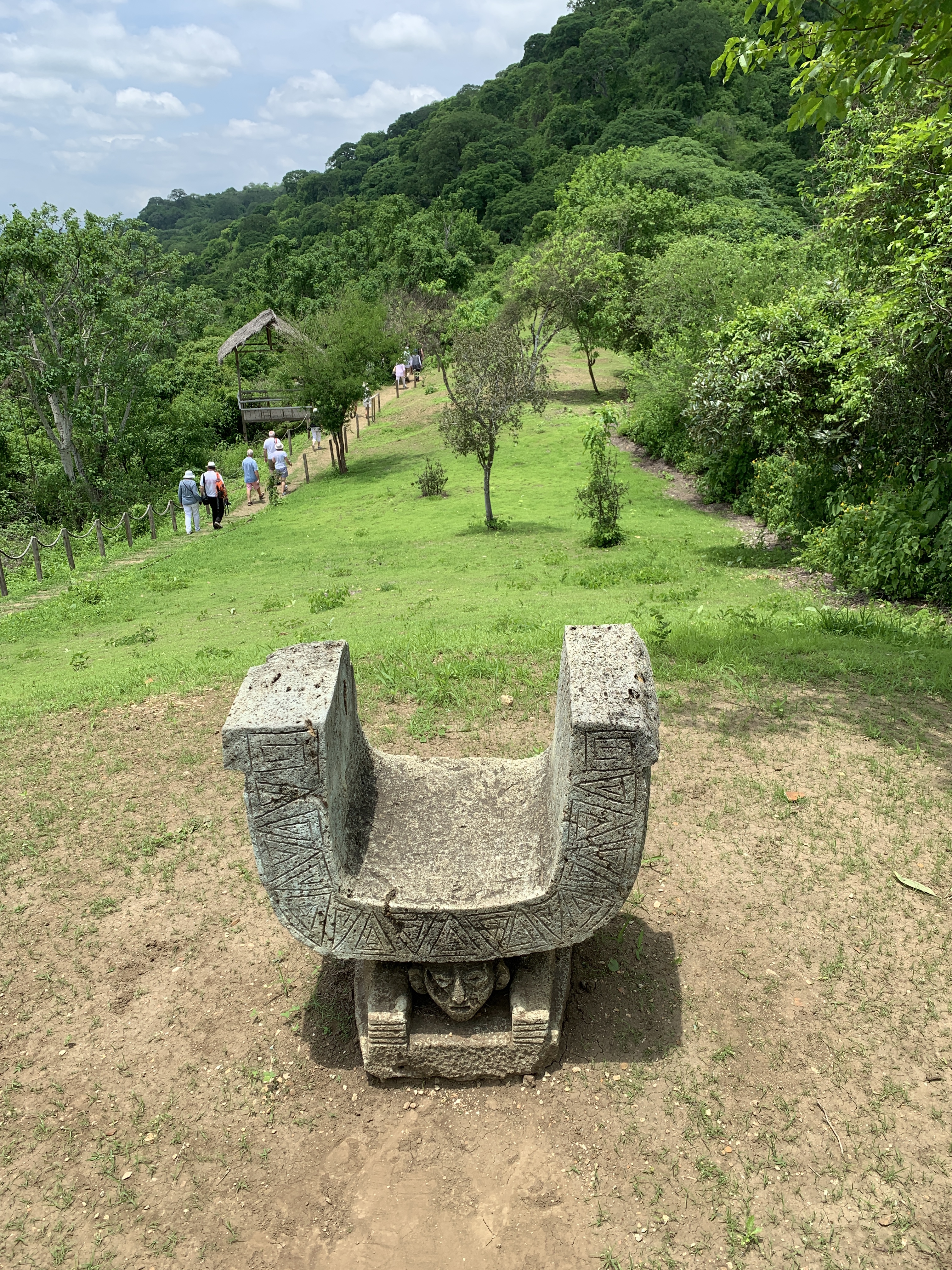 The site 30 Kilometers (18 1/2 mikes) from Manta, covers 3,500 hectares (8,350 acres) with some 600 structures on a hillside overlooking the plains and ocean with a peak at 500 meters (1,640 feet) and an average temperature of 25C (77F). It was the home of the Manteña Culture (AD 500 – 1600 CE). It is renown for it’s U shaped ceremonial chairs, which can be seen at the top of the hill. The originals were taken, as was the norm, back to Washington DC by the original Archaeologists and they can be found at the Smithsonian museum. Subsequently, others were taken and can be found in museums in France, Germany, Belgium, Switzerland, Italy, Argentina, Chile and Spain. One or two are in the On-Site Museum and others are in the process of being restored.
