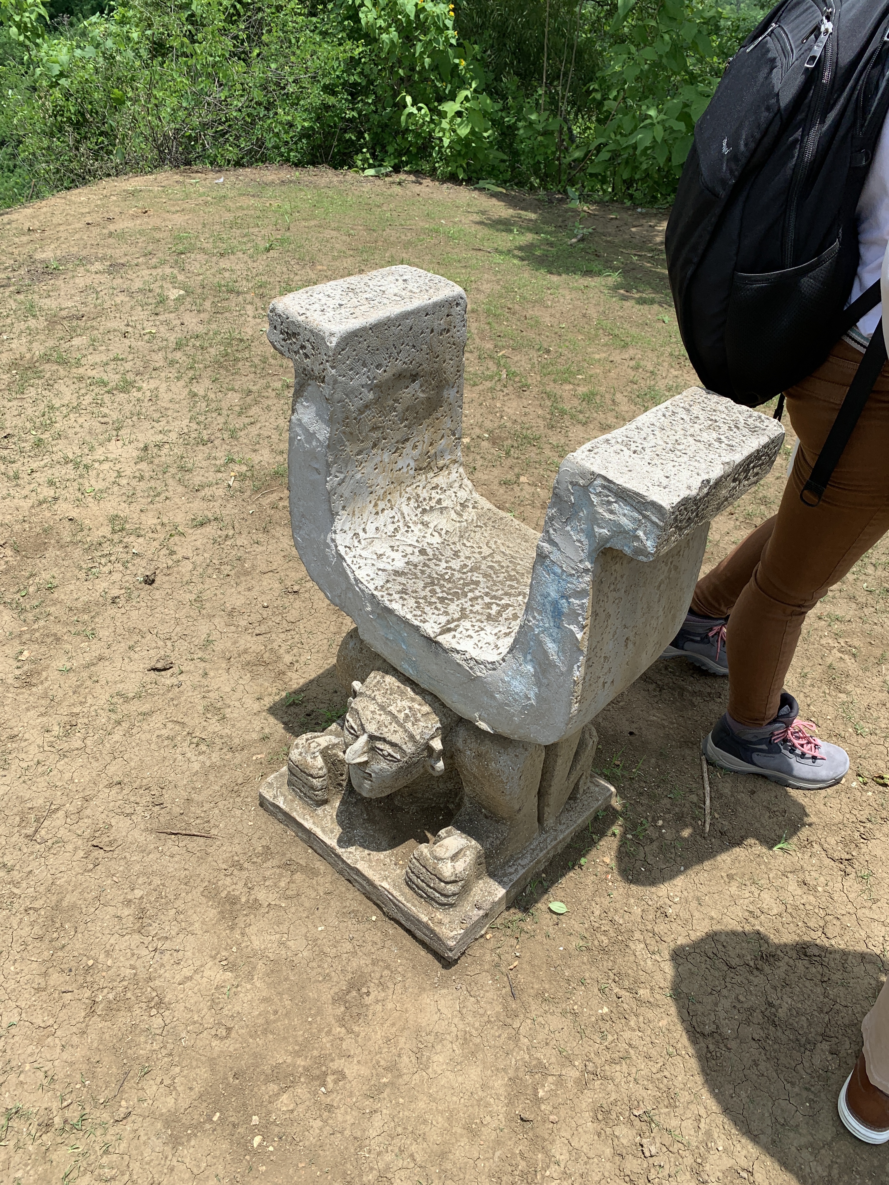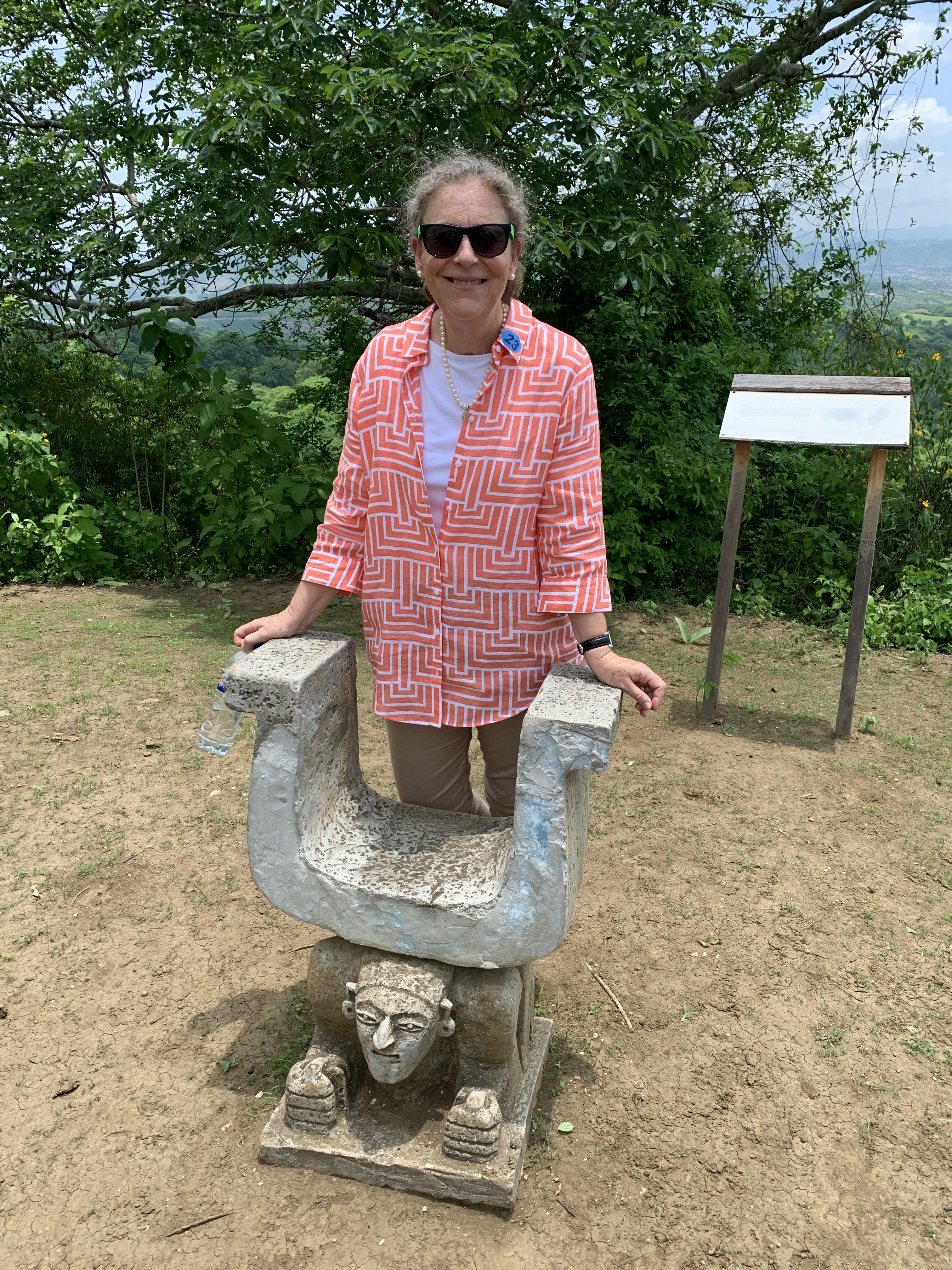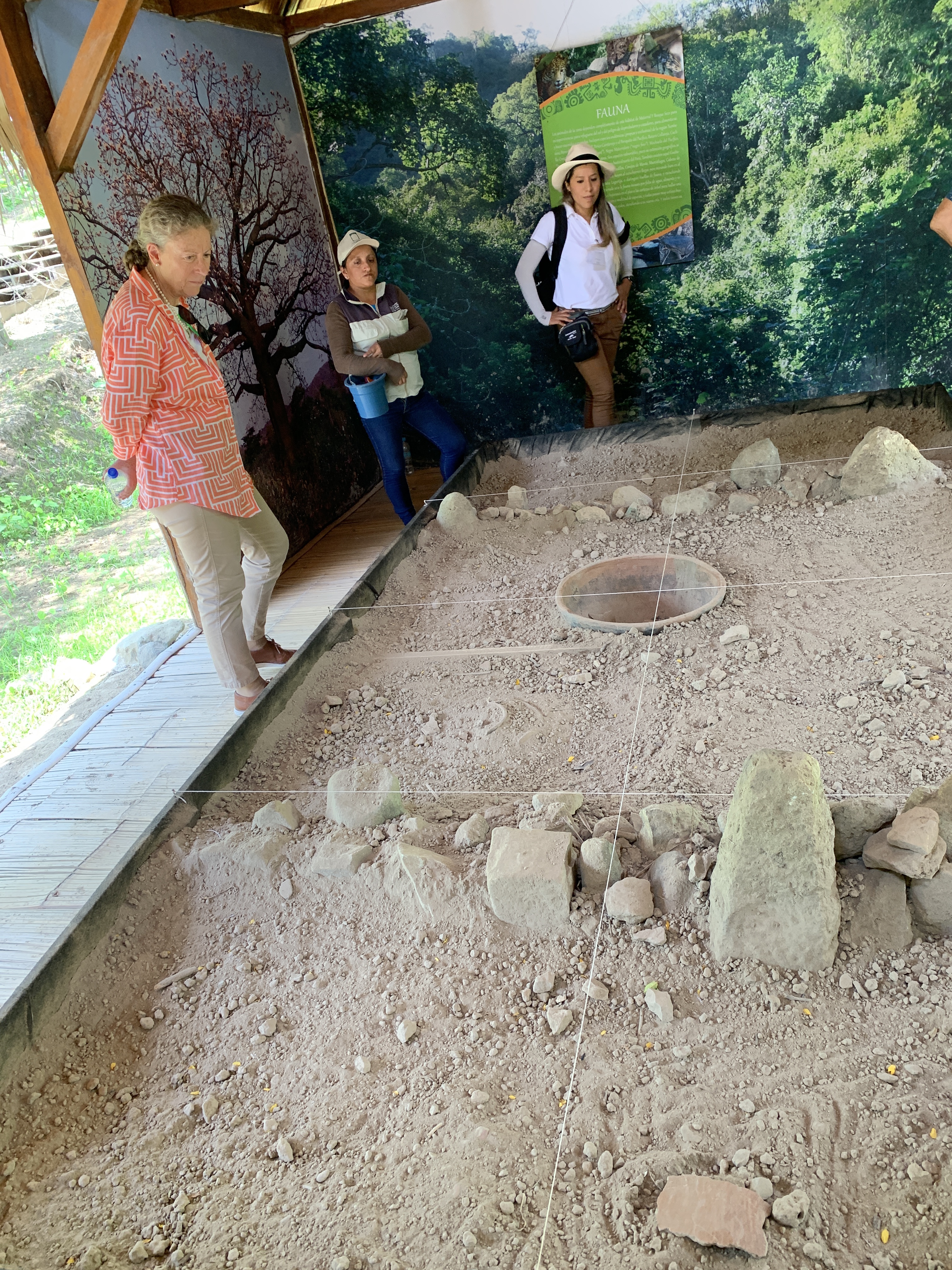 The site 30 Kilometers (18 1/2 mikes) from Manta, covers 3,500 hectares (8,350 acres) with some 600 structures on a hillside overlooking the plains and ocean with a peak at 500 meters (1,640 feet) and an average temperature of 25C (77F). It was the home of the Manteña Culture (AD 500 – 1600 CE). It is renown for it’s U shaped ceremonial chairs, which can be seen at the top of the hill. The originals were taken, as was the norm, back to Washington DC by the original Archaeologists and they can be found at the Smithsonian museum. Subsequently, others were taken and can be found in museums in France, Germany, Belgium, Switzerland, Italy, Argentina, Chile and Spain. One or two are in the On-Site Museum and others are in the process of being restored.