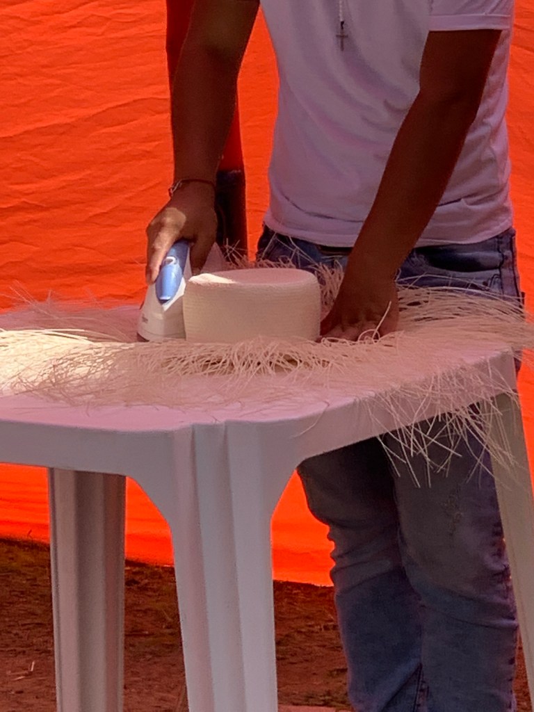 5. Once the hat is basically complete, but the various strands are still coming out of the sides, it goes to the “brim finisher”. This woman performs the highly specialized task of finishing off the sides of the brim.