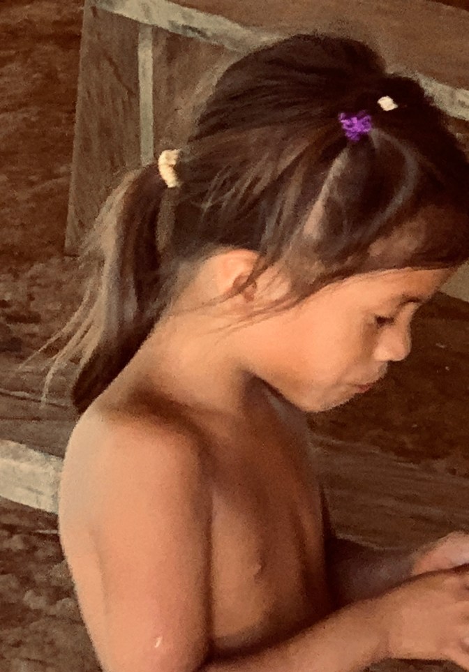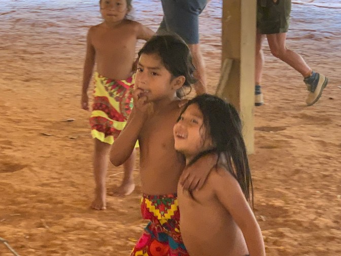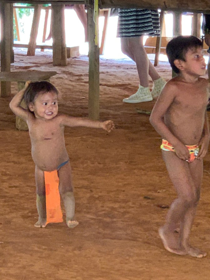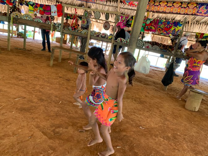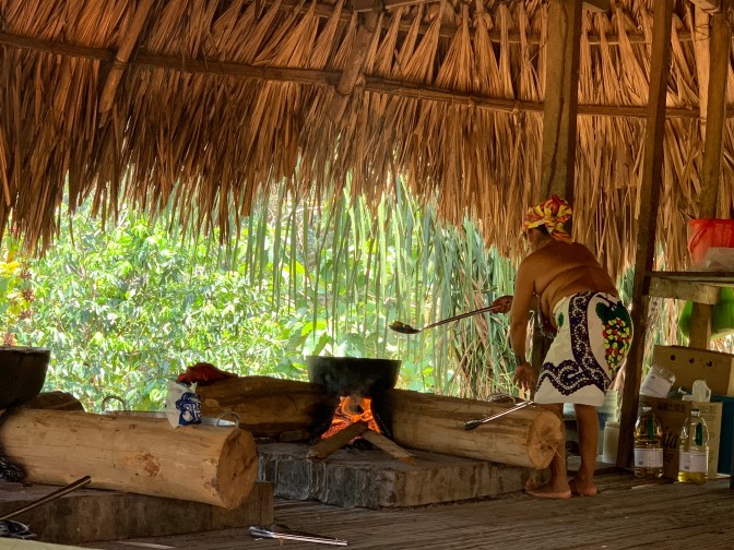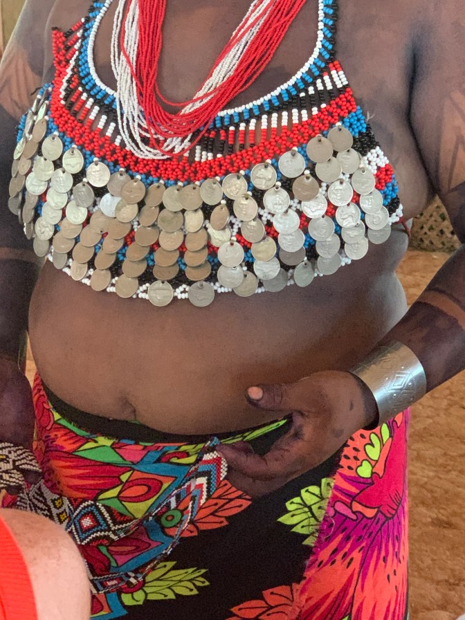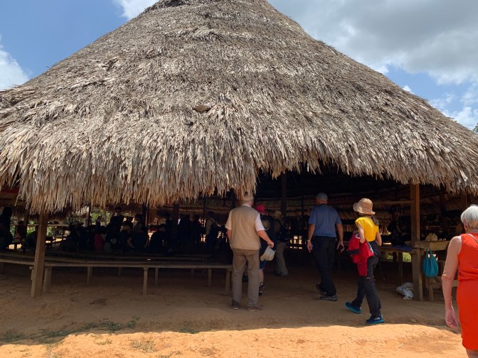 Another identical to the first large “performance” / meeting wood structure with 30 foot high conical dry palm frond roof and open sides, had a semi circular 3-tiered set of benches which allowed some 100 or so people to sit. The tribal chief greeted us and gave us a history of the tribe, they used to work wood, building canoes and other such utilitarian items before the Country government prevented them from the continued deforestation. Thus their only mode of survival was to open their home to tourists like us, for the “dry” season, selling their handicrafts and telling their story in words and dance.