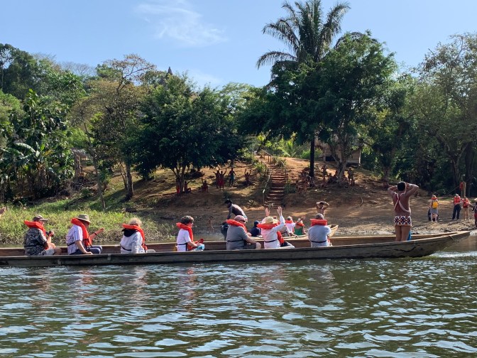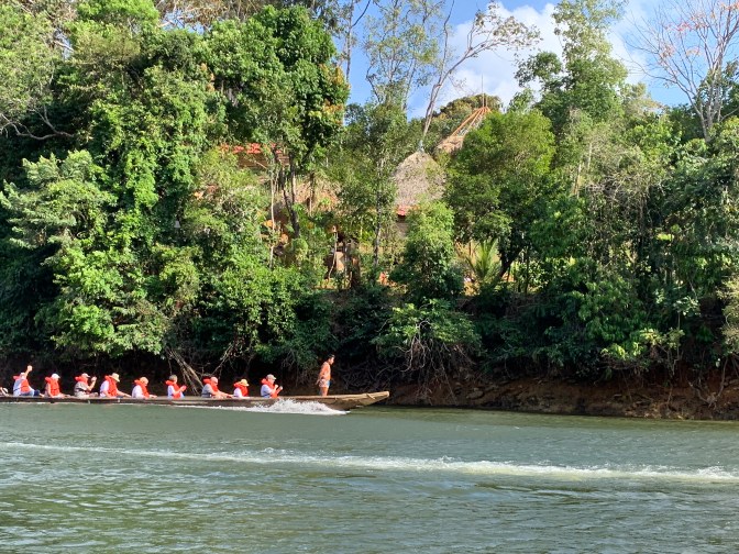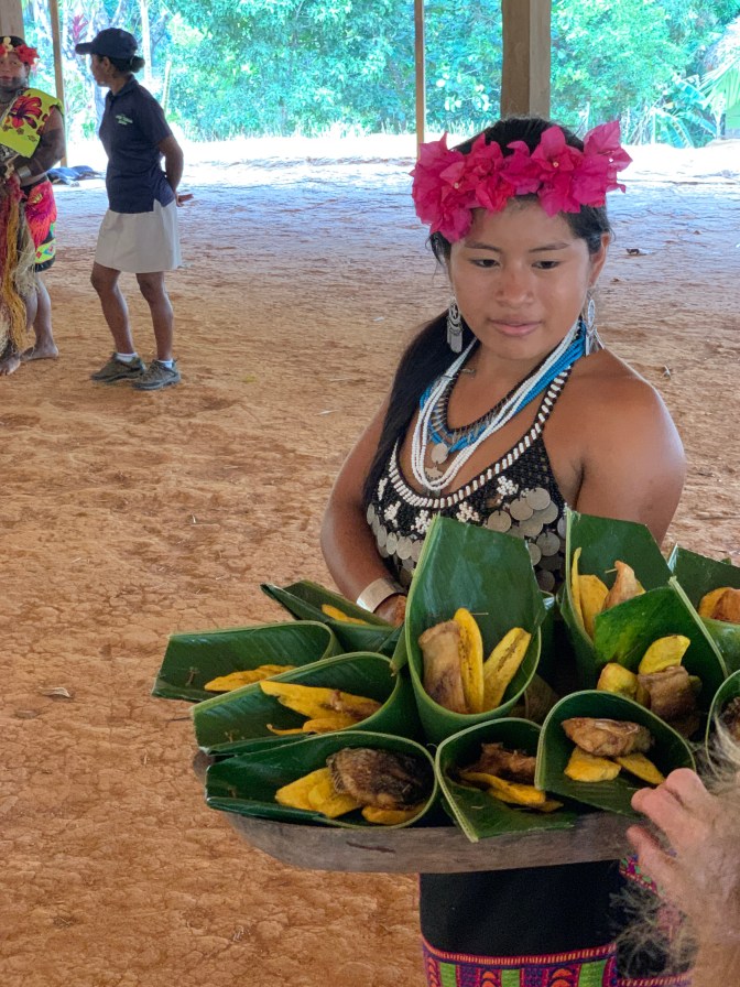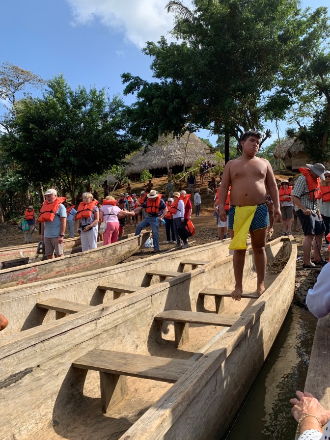We arrived at the bay at 6AM and saw sunrise over Panama City. We dropped anchor as it is a Tender Port. By 8 AM we were ready to go ashore, but the local authorities did not come aboard until after 10:30AM! The Princess Cruise ship that anchored after us was cleared and tenders were ferrying their guests ashore, we were waiting. We were concerned that it was going to be another “No Go”, but at 11:45 the Captain indicated that we could start going ashore, however, before entering the tender, we had to go through the temperature check. Tenders moved from the Port side. We were glad that we were able to go ashore and not miss out on the adventure of the day which was to visit the Authentic Indian Village (yellow 4 – Driver Ronaldo; Guide Astrubal or Ace for short). We eventually get onto the coach at 11:45AM, hot bothered and tempers flying as the Princess tenders and us are all arriving at the same disembarkation place and we have to wait in hot cramped positions on the tender after we arrive.