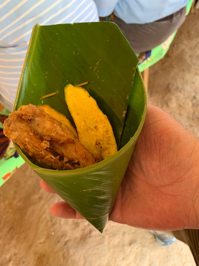 Climbing the hill to the first level, a large wooden hut with palm frond roof had 35 stalls, one for each family, selling their native handicrafts. This is now their livelihood, making handicrafts and selling them to tourists at an equivalent of US$1 per day of Labour. We then walked further and on the left was a sort of raised communal cooking hut featuring 3, 18 inch diameter logs in star form that held the large pots. A wood fire in the center heated the oil filled pots used to cook our Plantain (banana) and fish lunch served as finger food in folded banana leaves. The folding formed a flattish cone and the food items were carefully placed in the middle.