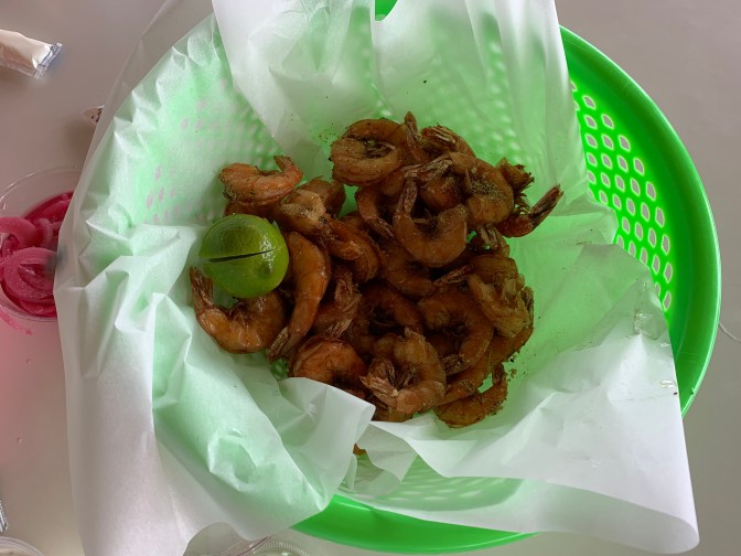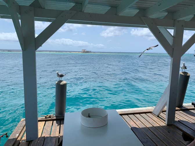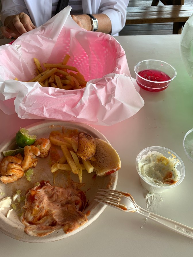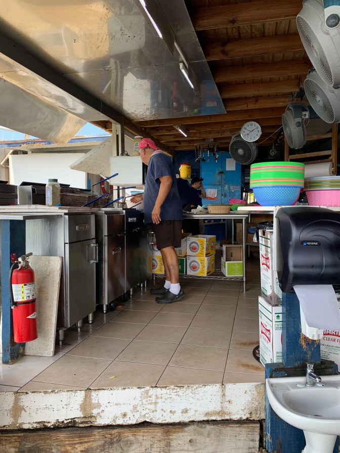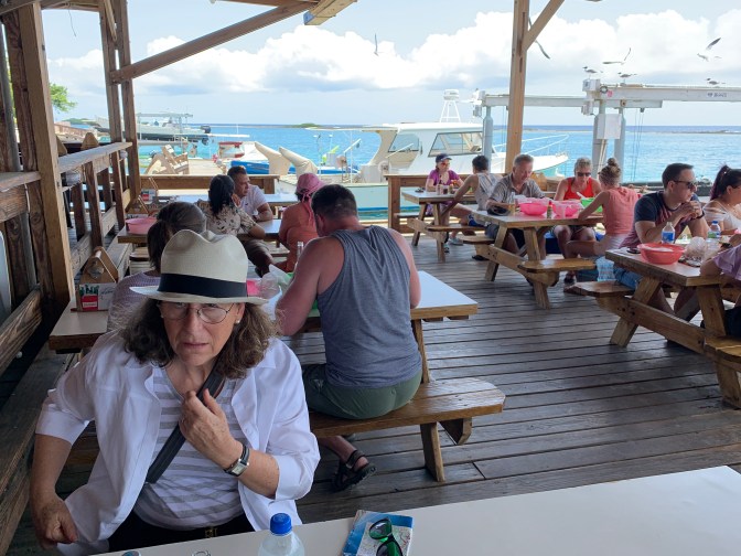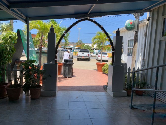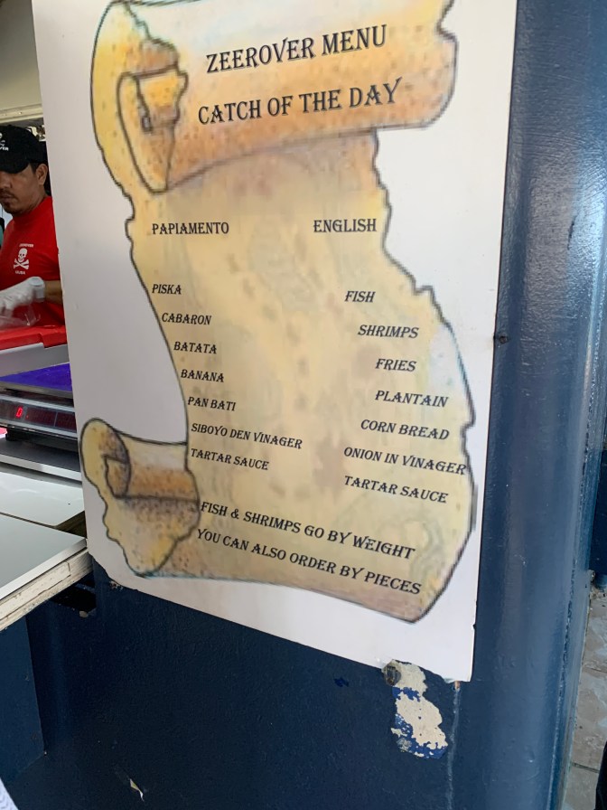 The deal is that as you enter, you queue up at a grubby counter. On the side is the menu, permanently painted on the wall – Fish, Shrimp, pickled onions, corn bread, tartar sauce, plantains (banana). That’s it, no amount, no price the only thing else on this board is the same menu in Papiamento! When you reach the counter – a sort of window in a rickety chipped wooden building, two people greet you. What do you want? Fish we reply. Today we caught X and Y – Which did you want? We picked one. How much? As the man dug a scoop into a cooler, picking up some fish and putting it into a clear plastic bag, and placing it on the scale. What else? Shrimp, we replied. He got another scoop in another cooler placing the result into another plastic bag, Enough? No a bit more. On to the scale. This continued until we had ordered one of each item on the menu. The lady would keep tab and after each item was weighed it was put into a plastic salad washing bowl. You paid and were give a piece of wood with a numeric on it. Next to another window to get drinks.
