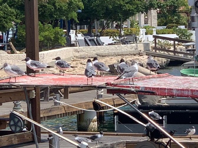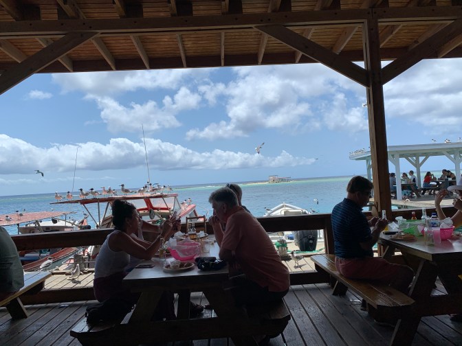 At which point, the rickety planks led you to a platform over the ocean with benches and a grubby table, seagulls on the fishing boats in front, and a gorgeous turquoise blue ocean. On the way to the tables, we passed the cooking pots, where you could see the your food being deep fried, with some sort of special tomato based sauce. The plastic bowl arrives at your table with napkins and no silverware. The banquet begins! At various strategic places around the eatery are wash basins to rinse / wash your hands as they get too grubby, or once completed. We thought the kilo (2.2 lbs) of shrimp would be too much, but none seemed to be left in the plastic bowl. Likewise with all the other bits of food. The six pack of cold beer in the ice bucket (they were small) helped the food to go down. A bottle opener was at each table. A truly brilliant meal, not for those who like fancy table service, but the locals flock to this place. Our taxi driver, admitted he goes there every Thursday. There was not one person from the ship and all the tables were filled with locals. Hot, all open to the elements, including birds, but they seemed to respect the artificial line between the fishing boat and the beginning of the restsurant. A 40 foot plank led to three tables under a palm tree roof area even further out to sea. Where we sat we had to be careful not to drop anything as it would have rapidly been at the bottom of the sea.