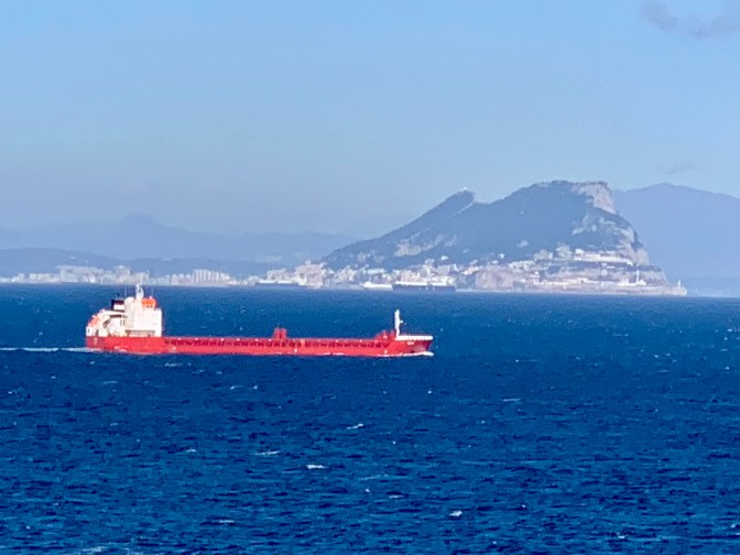 The day was the first smooth sailing, sunny warm day since we started this journey, which was very welcome. The big excitement was the entry into the Mediterranean Sea passing to our right (starboard) Tangiers, Morocco and to our left (port) Gibraltar with a bare 8 miles in between. Good visibility although a bit of haze was evident, but overall a great sight. As the Captain explained, those ships entering the Mediterranean from the Atlantic must keep to the south – Morocco side) and those ships leaving the Mediterranean and entering the Atlantic must remain on the northern (Gibraltar / Spain) side. This took place about 1:30 PM just as we were finishing lunch.