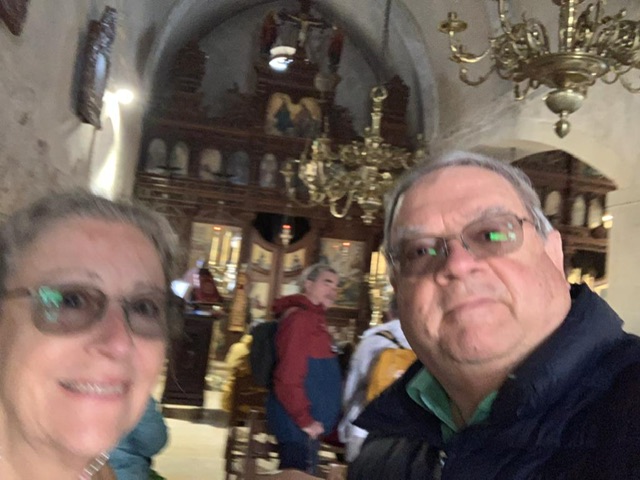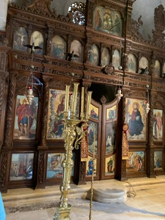 Since we had both been to Knossos on prior visits to Crete we opted to travel some 1.5 hours over the mountainous terrain to one of the 35 monasteries on the island – the Ecumenical Patriarchate Holy Metropolis of Rethymno and the Avlopotamos The Holy Monastery of Arkadi OR the Arkadi Monastery for short! It is located on Mount Ida at an altitude of 500 Meters (about 1,00 feet) above sea level and consists of a fortified complex with a 2 aisle central church. It was a 13th Century Monk – Arkadios who founded the monastery. On November 9th, 1866 during the Cretan revolution against the Ottoman Turks that the complex was attacked by the Ottomans. The local monks under Abbot Gabriel Mannakis, gave safe haven to some locals (the Revolutionary Commission of Rethymnon) that the Turks wanted. Rather than give up after 2 days of fierce fighting, they all congregated in the room with the gunpowder and set fire to it, killing not only themselves but a large number of Turks. This was the beginning of the end of Ottoman domination of the island. It is interesting to note that last century the remaining 700,000 Ottoman Turks were banished from Greece at the same time as 1.2 million Greeks were banished from Asia Minor. Arkadi Monastery Phone 0030 28310 83135and 86; email info@arkadimonastery.gr; Web – www.arkadimonastery.gr. It is still a monastery with half a dozen monks and receives many pilgrims and visitors. Many of the rooms in the old fortification are set out as they were during it’s heyday and an interesting museum with many of the original iconographic representations are visible.