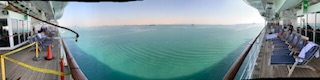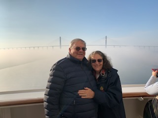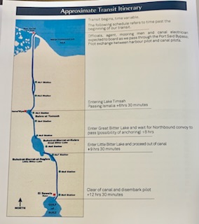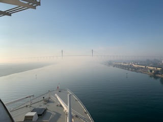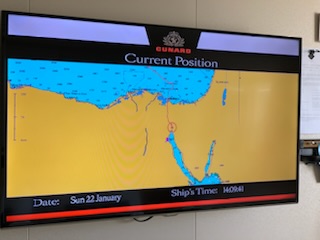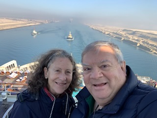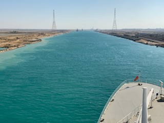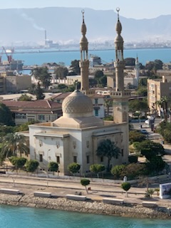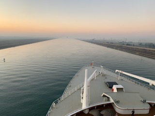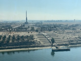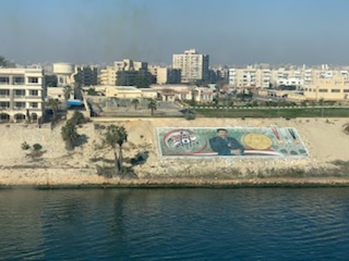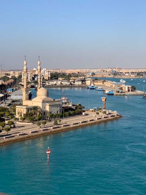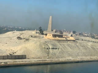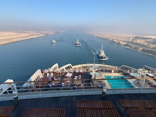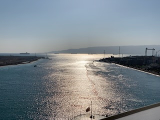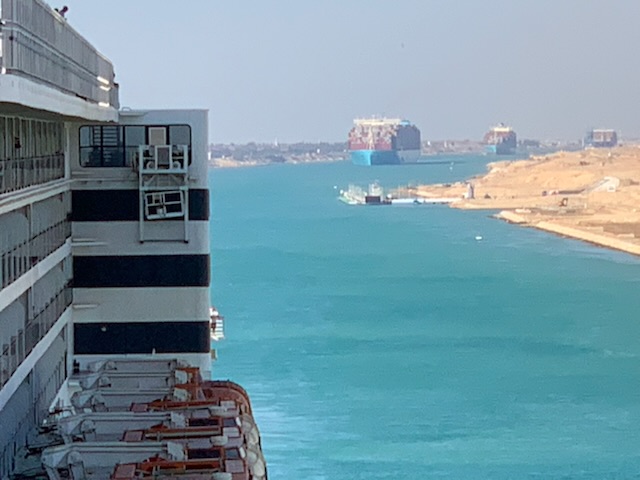 The day started chilly (in the 50’sF) and very misty / foggy. We were out in the front of the ship on the 11th floor as we approached the (Japanese) Friendship bridge (Al Salam) and all of a sudden it completely disappeared in the mist. Even being directly under the bridge it was barely visible. As the day wore on the mist lifted and the heat started up. We spent some time in the Commodore Club hoping it would be like the Panama Canal Transit we experienced nearly 3 years ago, namely that the expert commentator would be in that room and could be availed to answer questions. Indeed Vivian Rowen, the Egyptologist lecturer was there, and gave some general discussions but not in the detail that the chap did transiting the Panama Canal as he had run that canal and his father ran it before him. As the day wore on we moved from one place to another around the ship until we exited into the Red Sea by the City of Suez (Population 1 million) over the Ahmed Hamdi Tunnel at about 4:30PM. When the canal was built it was 164 Kilometers (102 miles) long and has not been enlarged and is 193.30 Kilometers (120 1/8 miles) long, 24 meters (79 feet) deep and 205 meters (673 feet) wide or more. Some places the canal allows for 2 way traffic, but the Great Bitter Lake is where the ships traveling in opposite directions wait for the ability to pass through the narrower sections. It was in 2015 that the 35 Kilometer (22 mile) parallel channeling the center part for this 2 way traffic was added. The plan is to have the entire Suez Canal a “dual carriage way” with ships going in both directions. In 2021 they stared the widening of the Southern entry by an additional 40 Meters (130 feet) and a depth of 22 meters (72 feet) for the 30 Kilometers (19 Miles) from Suez to Great Bitter Lake.