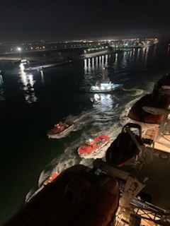 An early start for a very exciting day – Transit of the Suez Canal from North to South. At 3:30 AMwe lifted the anchor and started the entry into the canal at the Port Said entry. There was one container ship in front of us so we were the second ship to enter the Canal at 4:00 AM. It was still dark but we could see lights and buildings on the shore. We specifically opted for a cabin on the starboard side as the western side of the canal has a lot more life, towns, green area and activity vs the Sinai desert side which is all desert. If you plan on going from the Red Sea to the Mediterranean then choose a port side cabin. It is interesting to see the Sinai (East) side but lots more to see on the other side.