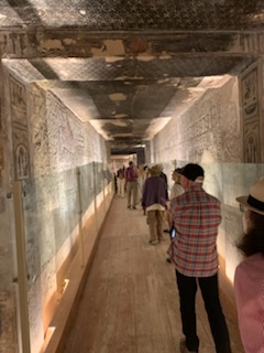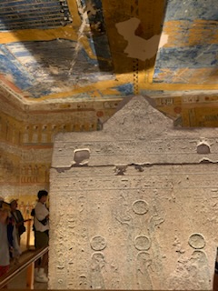 The final Tomb was KV2, that of Ramses IV also of the 20th Dynasty. It should be noted that the earlier Dynasties were buried in pyramids (like Chofu in Giza) and those, starting with the 18th Dynasty started to be buried underground in tombs like in the Valley of the Kings. This tomb was particularly impressive with the vibrant colors on the walls and the fact that the enormous stone sarcophagus lay in it’s original resting place in the burial chamber itself. It was visited and measured by the explorer Richard Pocoke in 1737, it served as the lodging place for Champollion in 1828 while working on the decipherment and early Coptic Christians used it as a church and left graffiti on the walls. The ceiling is decorated with colorful cartouches of kings names as well as birds, vultures etc. It has many beautiful scenes of the king being taken by boat to heaven to be judged. If his heart was heavier than a feather it was eaten by the vulture god and disappeared forever, however if lighter it went on to the God of Final Judgement Osiris to be Judged. Many scenes were observed that are similar to the prior tombs with excerpts from the Book of Caverns, Dead and Gates and the ceiling above the sarcophagus depicted the Book of Heaven.
