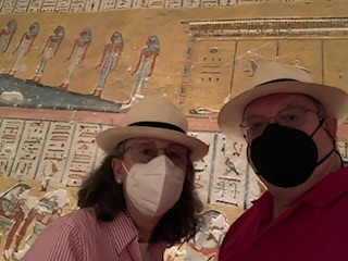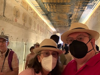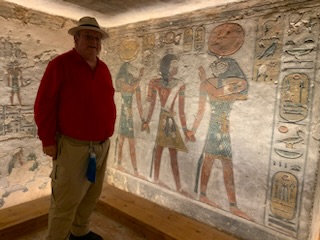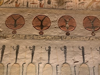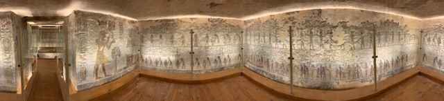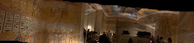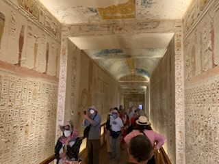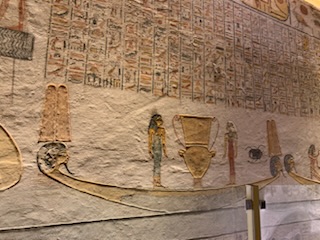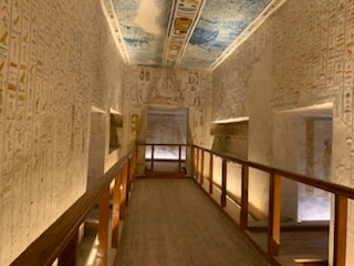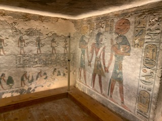 We walked to KV11 which is that of Rameses III, the second king of the 20th Dynasty – 1187-1151 BCE and ruled after Ramses II during the sponge of the 20th Dynasty. As you enter the tomb, your ticket is punched so you can only visit 3 tombs. You enter through metal gates which can be chained shut, into an 8 feet wide and 10 feet high, 60 feet long corridor, flanked by two animal (Hathor)-headed columns. As you descend the corridor you marvel at the sight of the walls and ceiling being filled, top to bottom, with a myriad of hieroglyphic inscriptions and pictures all carved into the stone for posterity. Most are still well preserved and readable. It is one of the longest tombs in the valley measuring some 125 meters (about 410 feet) long. The first two openings, left and right show secular scenes. A little further down are 8 (4 on each side) side rooms with scenes and vessels / jars of food for the afterlife. A “dead end” corridor during construction, was stopped as it hit KV 10 the tomb of Amenmes. This first section to the blockage was built by Set-Nakht, father of Ramses III. The pharaoh then took over the building of the tomb moving the corridor to the right. This continued on with side chambers. One of which is gated off, however, there was a man who (for a fee) allowed you to jump over the fence and enter the chamber. Anne kindly recommended that I jump the gate and visit the spectacular room with its colorful images of Ramses III meeting Osiris, Isis and the other gods related to death and the afterlife, together with numerous inscriptions. The final corridor leading to the burial chamber was equally magnificent, but the burial chamber is in a bad state of preservation and entry is prohibited. The mummy is in the Cairo Museum and the sarcophagus is in Paris.