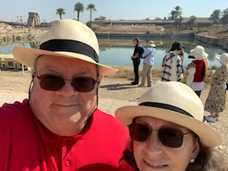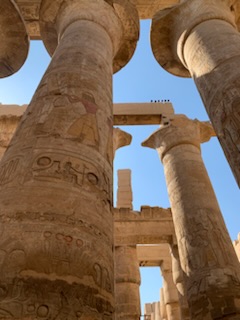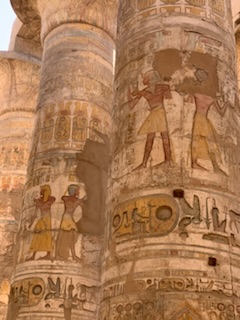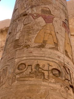 The “inner sanctum” between the second and third sets of pylons, was dedicated to the father of fathers, the mother of mother’s, the God of Gods – Amon. His wife Mut and son Khons form the holy trinity. Of note is that the cult of following Amon as principal deity and thus the power of the priests, was temporarily suspended as Tutankhamen’s father Akhenaton (mother Kiya) attempted to move the capital and the religion away from Amon to the God – Aton. This worked during his lifetime but Tutankhamen moved it back to the cult of Amon as soon as he became Pharaoh. This area of the complex was the “Holy of Holies” and only priests, pharaohs and other elite were allowed to enter this area. The columned Hypostyle Chamber as it is known, was constructed during the reign of Seti I and was completed by Ramses II. Ramses II was one of the most powerful of rulers as he ruled for 67 years and had 92 sons and 106 daughters, four of these daughters became his wives of which he had some 90! The enormous 134 columns make humans look like ants and all are carved with figures and hieroglyphs which still maintain their color. The central colonnade forms a cross while the lateral colonnades fill the rest of the space evoking the reeds that grow in the River Nile. This section had a roof, which was partly stone and partly wood so was dark, but rays of light were permitted to enter the area by allowing some space between the top of the columns and the roof. The largest third section past the third lot of Pylons has not been restored to the same extent and other than two obelisks (one to Thutmosis I and the other to Hatshepsut), we did not see, but instead turned to visit the sacred lake which had two underground water tubes to the Nile so water could flow in and out of the lake maintaining it fresh. On the way we stopped at the long wall of inscriptions where we learned that the hieroglyphs can be read left to right, top to bottom or right to left. The key is the animal and which way it is facing. You always read toward the Duck or other animal. Pharaohs had two names, their birth name and the name they took when they became Pharaoh. If you see a duck with the circle behind (the sun) it’s head, the it is the birth name that follows in the cartouche. Of interest, but not relevant to this is that license plates of vehicles are written with the 3 letters facing one way and the 3 numbers are read in the opposite direction. Also there was a statue on a pedestal of a sacred beetle. This was a deity relating to death as the observers noted that this beetle buried in the ground at night and then became alive the next day. This was similar to the belief of death where the body had to be preserved as they would return to give new life to the body. However, the 4 key organs – lungs, liver, intestines and stomach had to be removed as the jackel God Anubis would devour these if left in place. The organs were placed in Canopic jars prior to mummification (with natron and linen cloths).