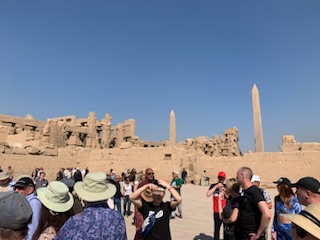 It was an early start as we had to depart at 6 AM soon after docking at the Port of Safaga (population 40K) on the Red Sea (Starboard to Dock, RHS Drive). We together with the other 1,000 people on this tour, were in for a 3 1/2 hour coach ride through the Western Sahara to the town of Luxor. On the way our excellent guide – Hossam Ragab Email:- hossamr723@gmail.com; Facebook:- Hossam-Ragab-1257. I mention this as he does private tours and we would definitely book him when we return for a 2 week tour of Egypt to get a more in depth view of the fabulous civilization from 4-5 thousand years ago.