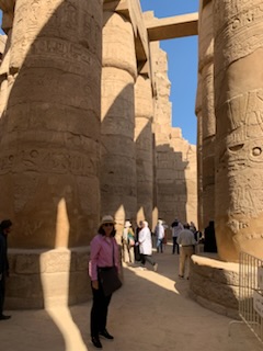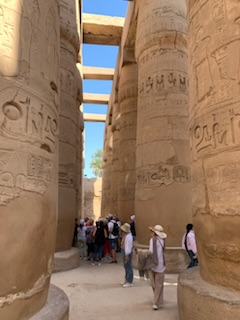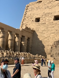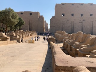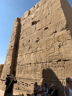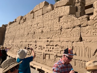 We then walked the final 200 yards (of 2 Kilometers) of the transverse path leading from Luxor Temple Complex of Ramses II to the Hypostyle Hall with it’s four pylons and numerous hieroglyphic texts and statues. It may be appropriate to remind oneself that Egyptian Hieroglyphs are alphabetic with some logographs, It was due to the finding of the Rosetta Stone in Rosetta Egypt, that Jean Francois Champollion following the earlier work of a British man, that we can read all these texts. On the Rosetta Stone are written praises by the people of Memphis to Ptolomy V in Greek (which could be read) at the bottom; Demotic which was the language of the commoners in the center, which was known and the Hieroglyphs in the upper part which could not be read, but as the other two scripts referred to the same actions, it allowed Champollion and others to decipher the upper script, assuming, correctly that it said the same thing.